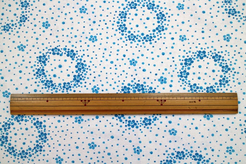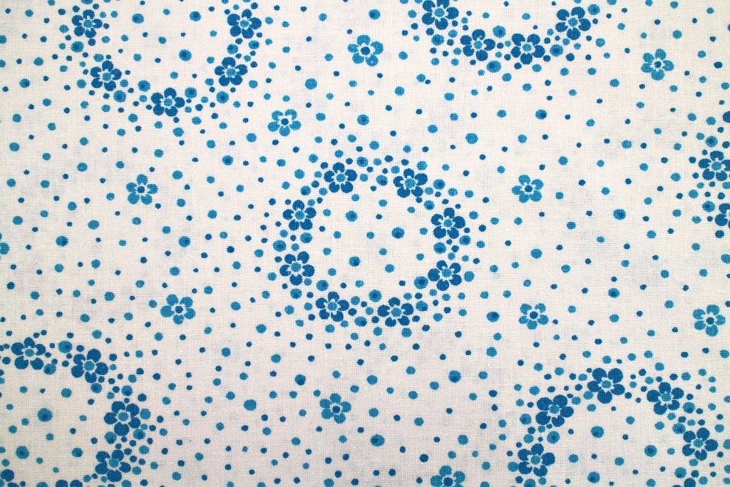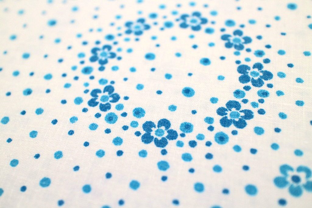 真っ白な生地に無数に散らばるブルーのドット&お花のリングが爽やかなコットン製ヴィンテージファブリック。