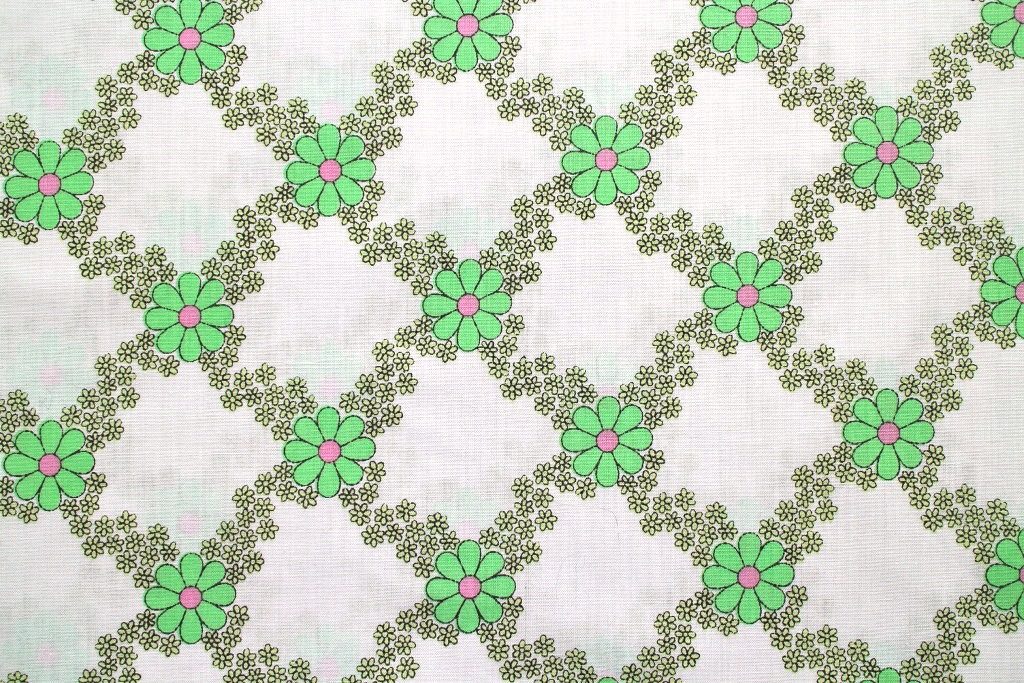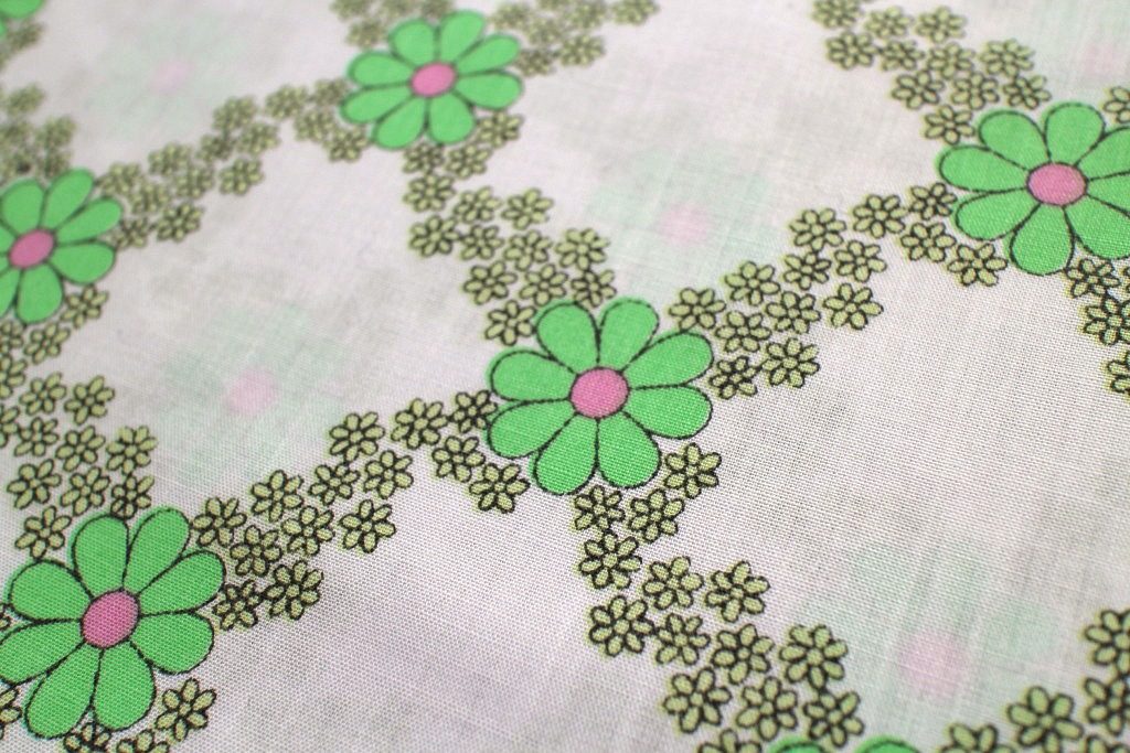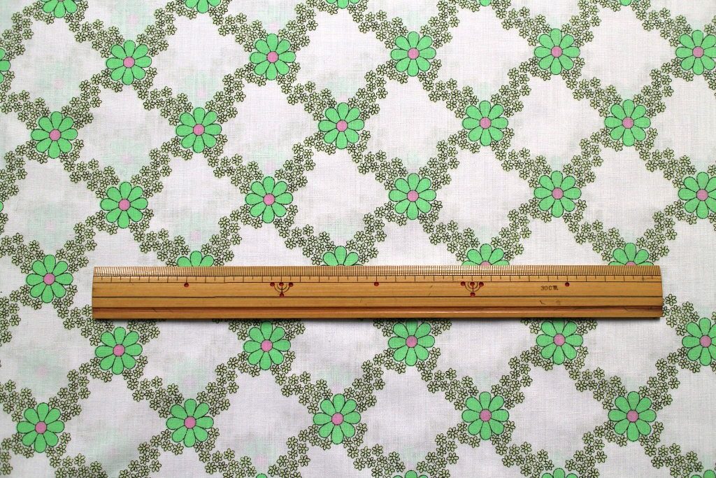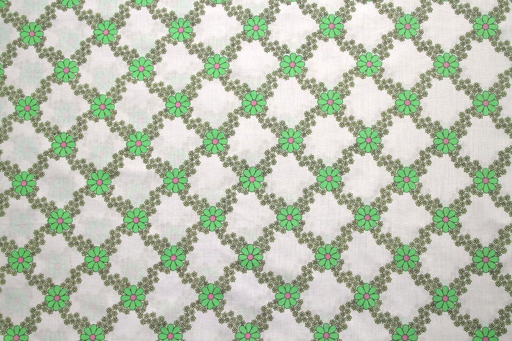白xグリーン お花の格子がノスタルジックなレトロ布 幅130cm