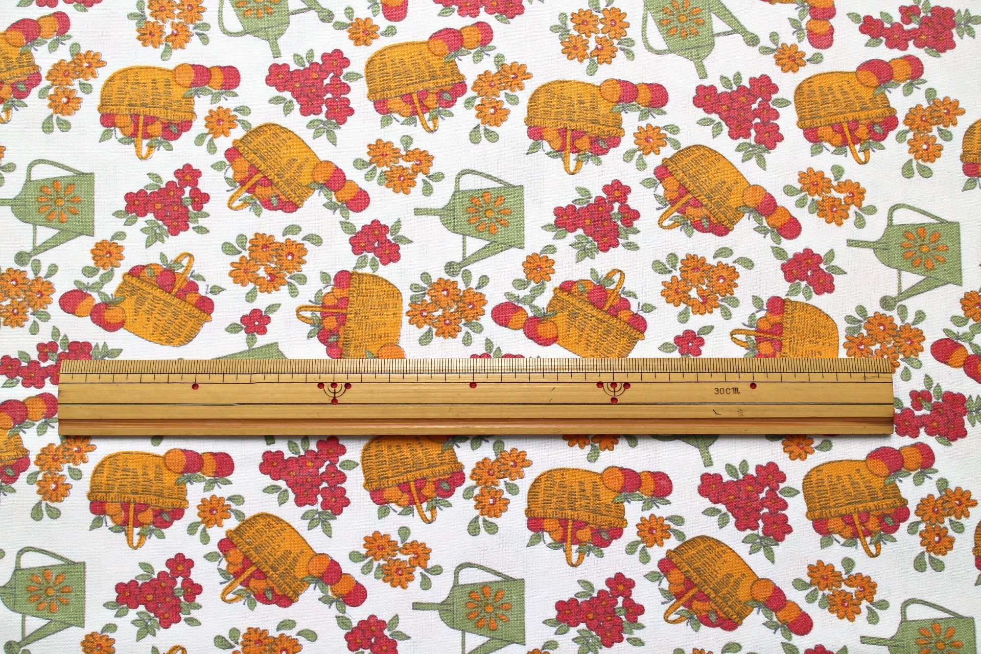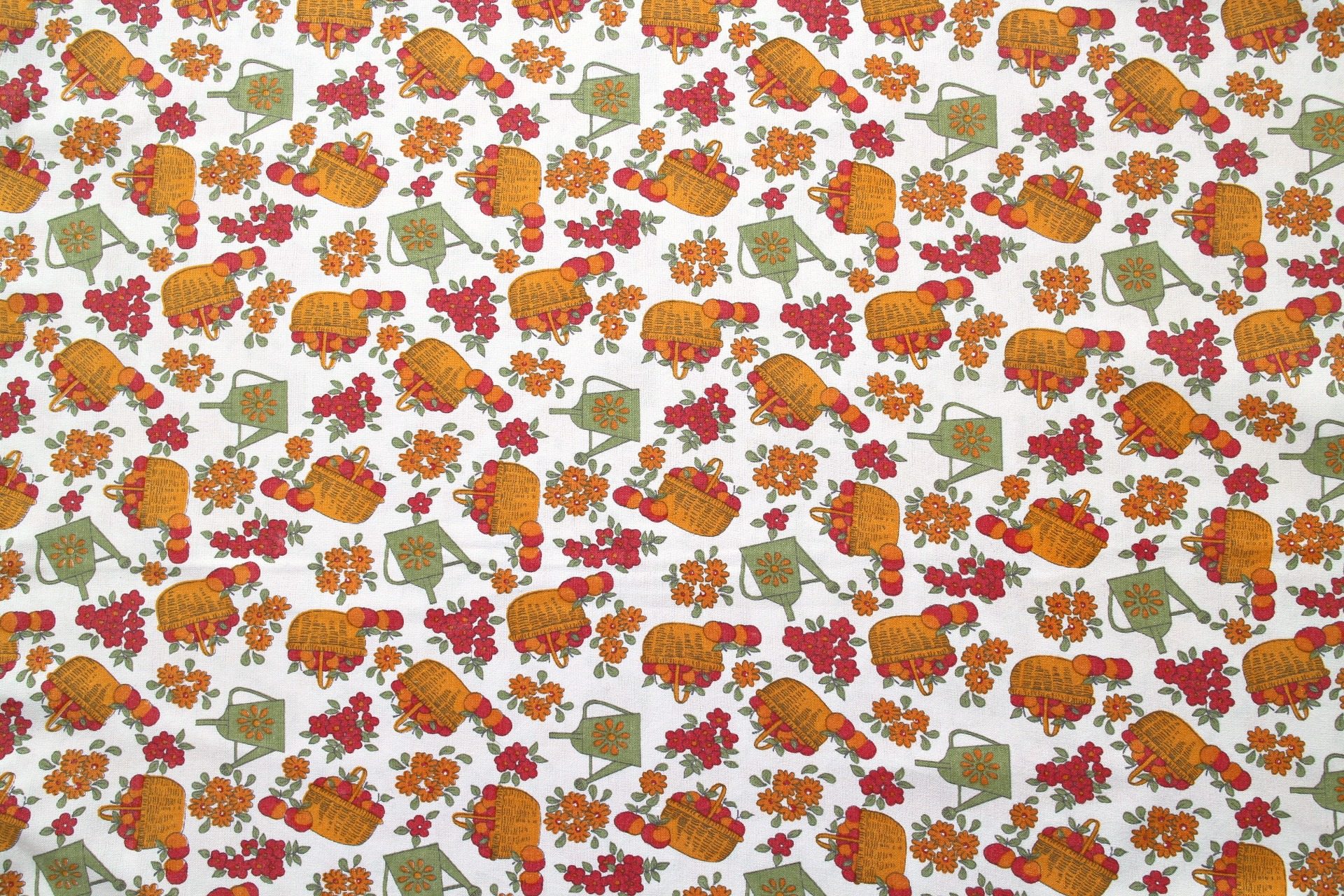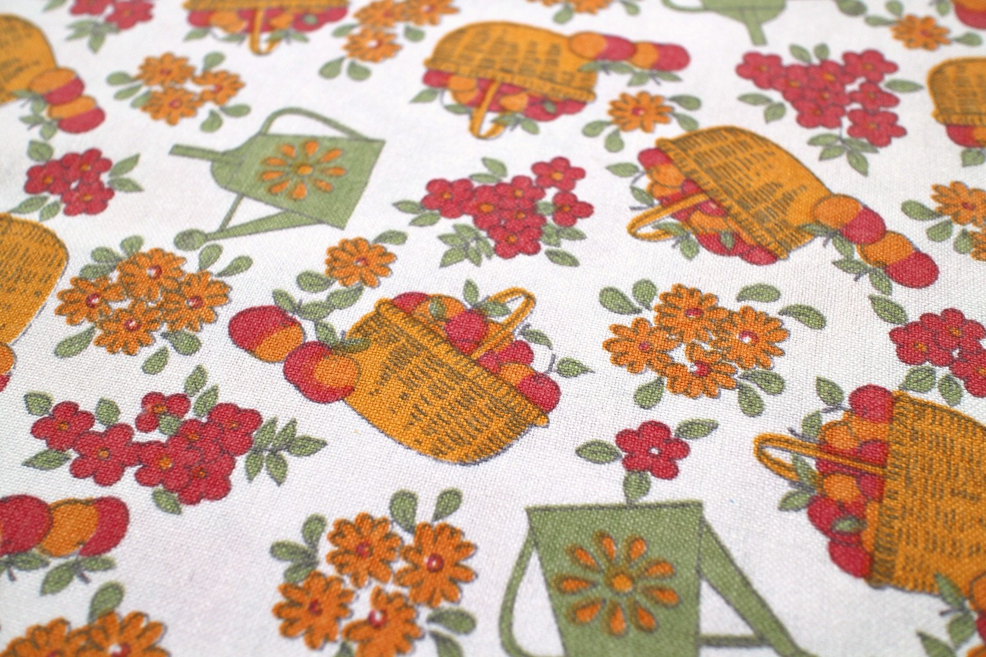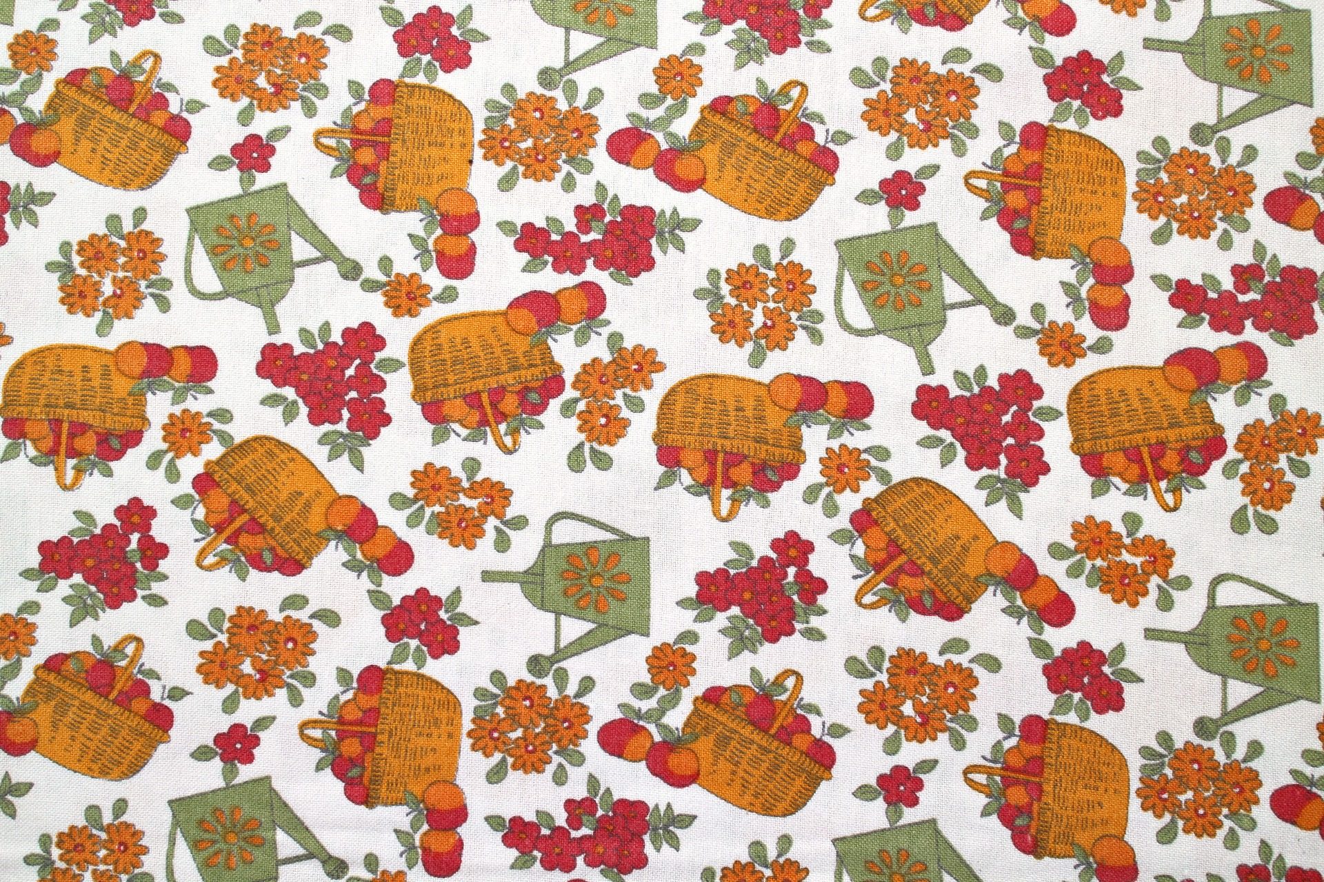 コンテンツにスキップカゴいっぱいのりんごやお花の束が生地いっぱいに描かれた、DDR時代のこども柄ファブリック。