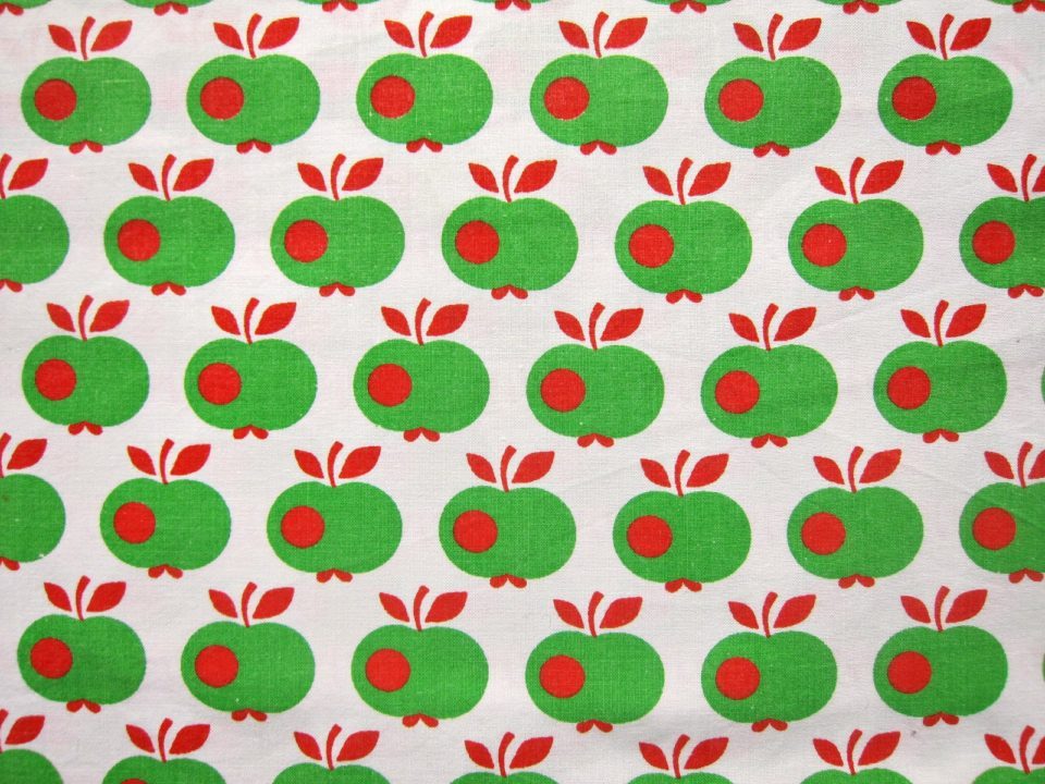 グリーンのレトロなりんご柄のヴィンテージピローケース。 赤い丸のマークが入っていて、とても楽しいデザインです。