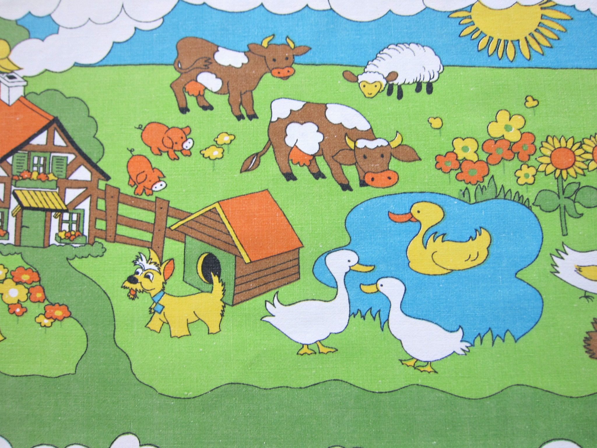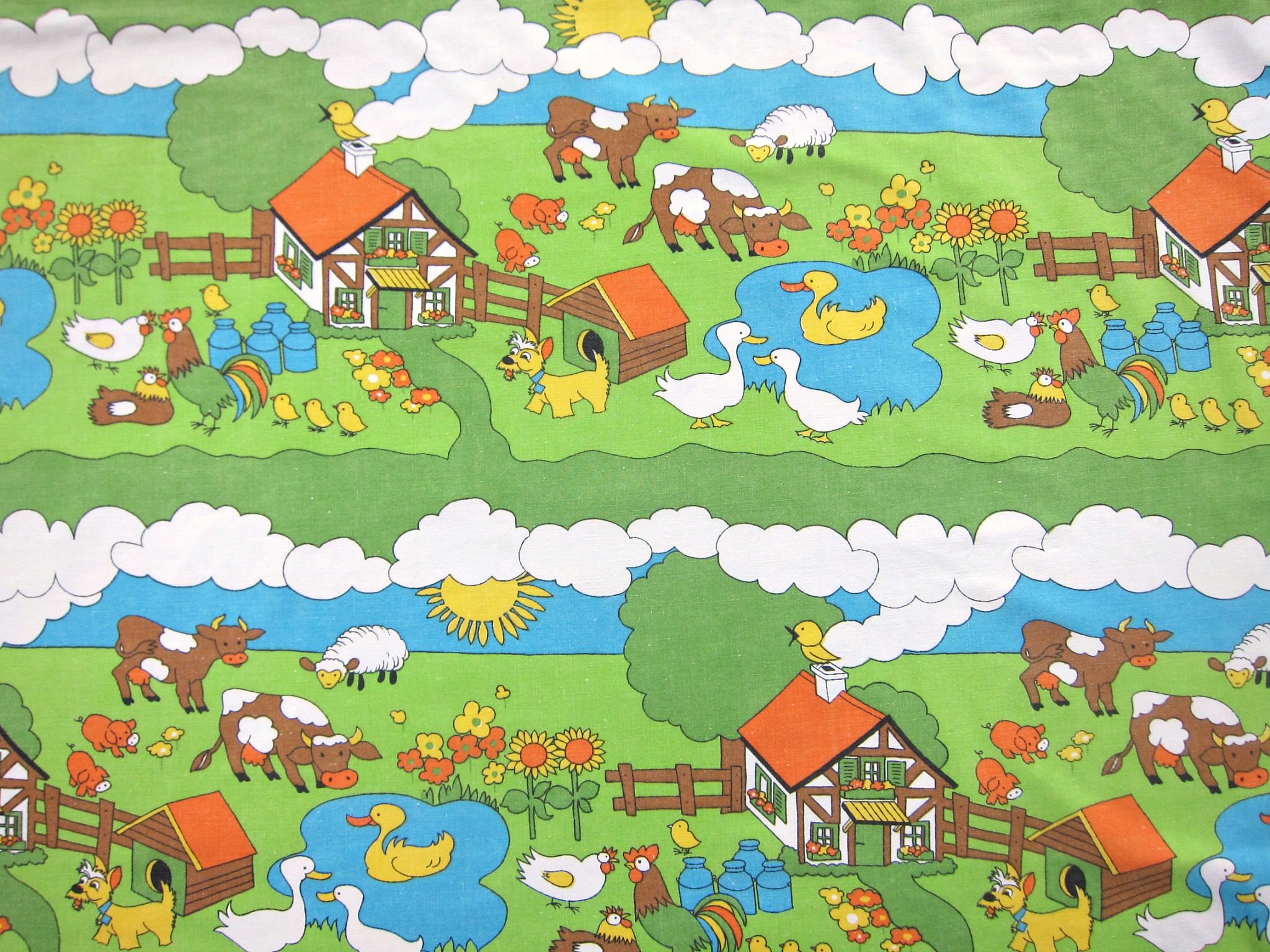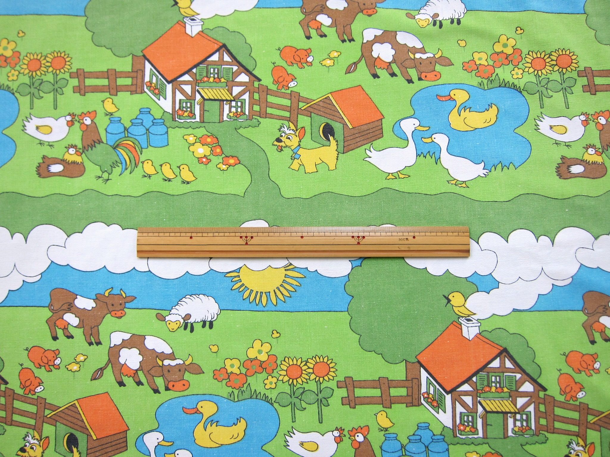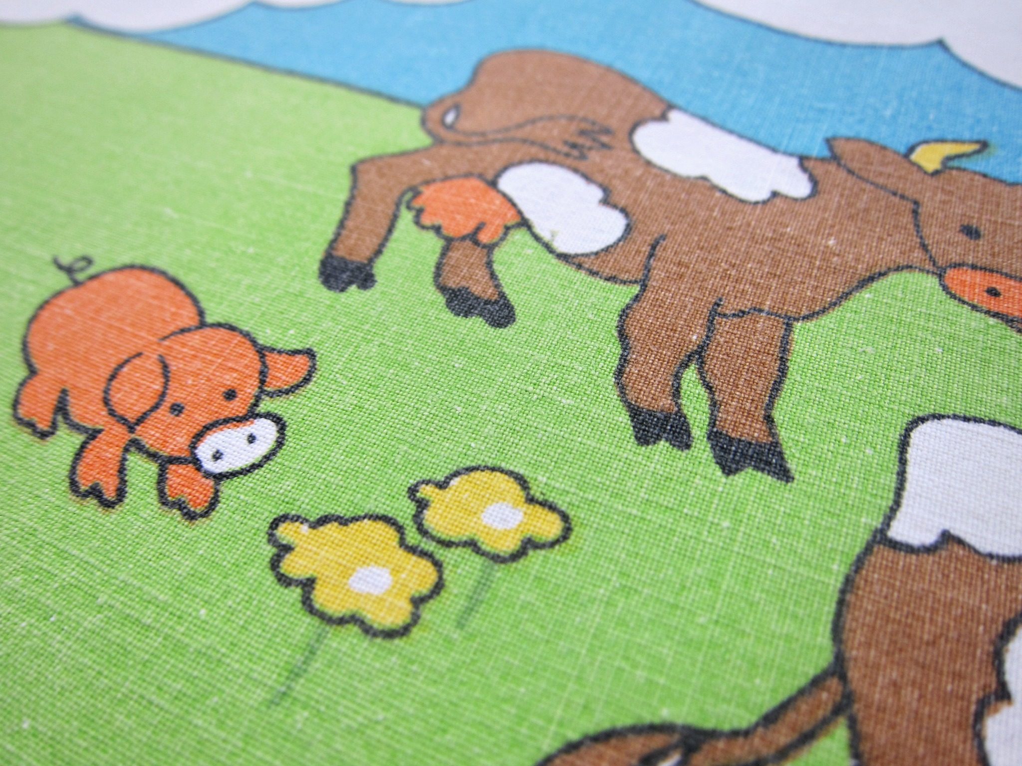 緑豊かな農場に、牛や鳥、小屋、空などが描かれたヴィンテージ生地。