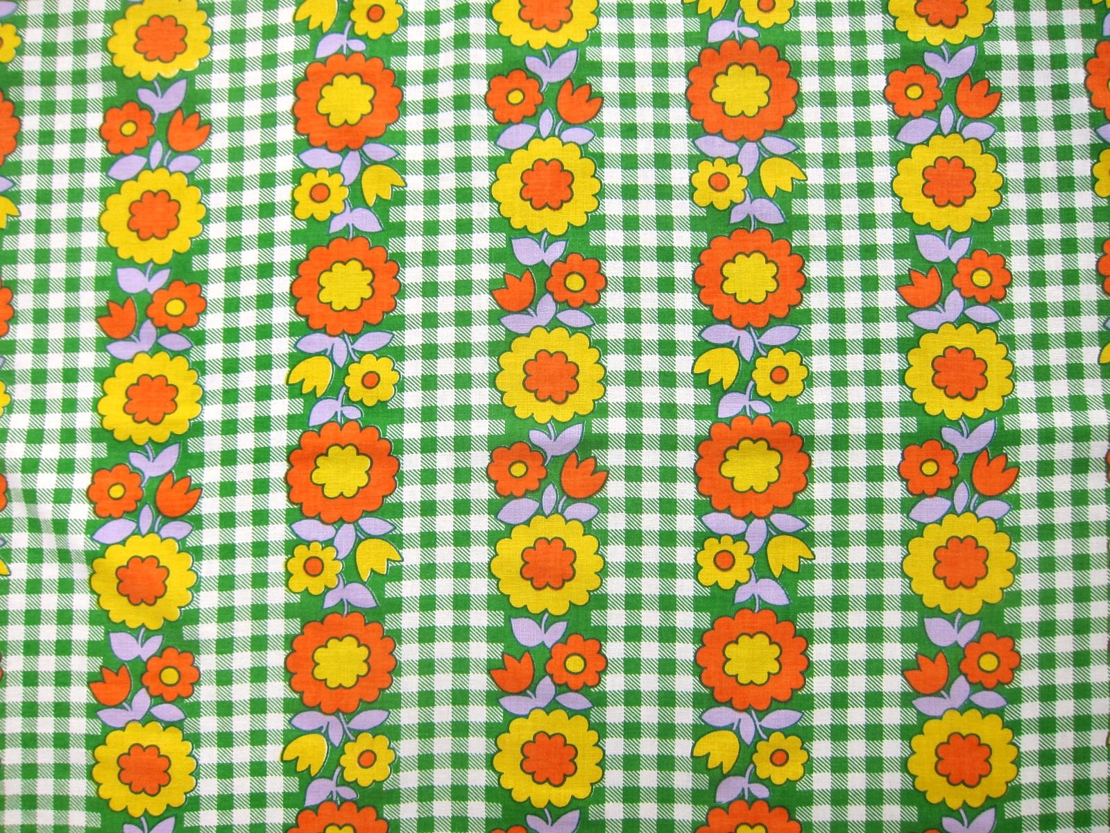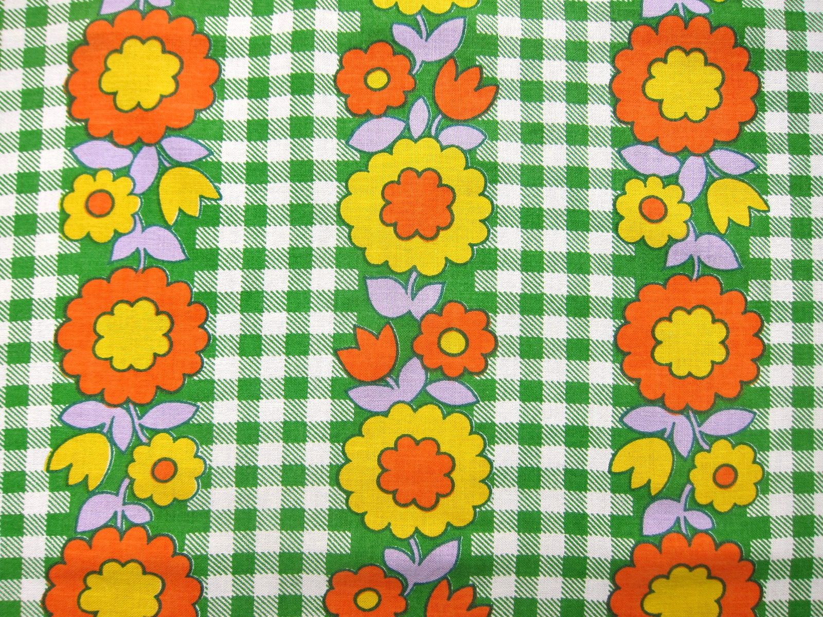 コンテンツにスキップグリーンのギンガムチェック地に黄色やオレンジの元気いっぱいのお花が並んだ、ノスタルジックなデザインのレトロファブリック。