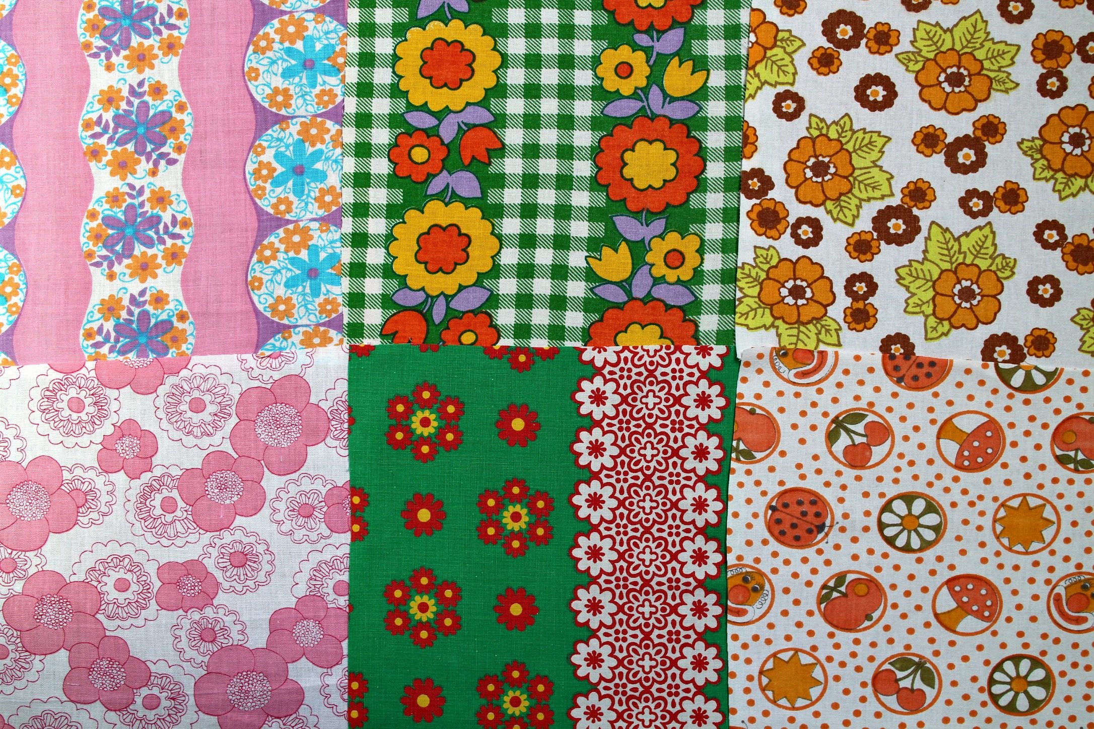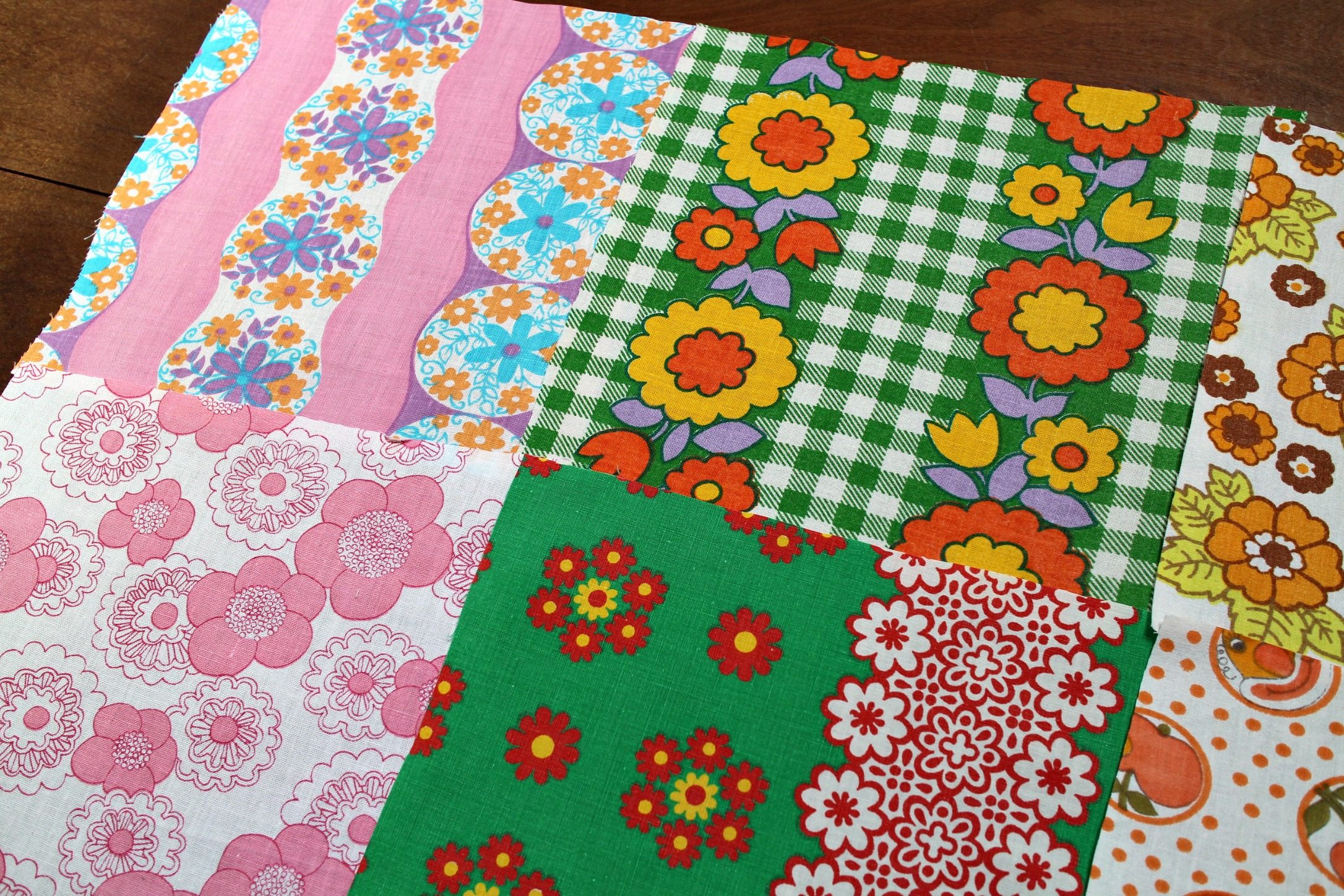 レトロな花柄を中心に、ピンク、グリーン、茶色のヴィンテージファブリックのはぎれを6枚セットにしました。 ノスタルジックな柄ばかりで、手作りの材料などにぴったりです。 1枚のサイズは20cm角です。