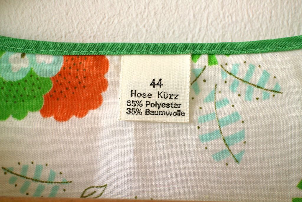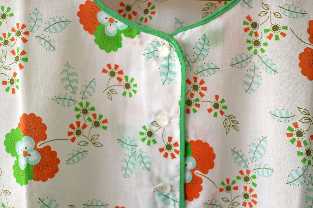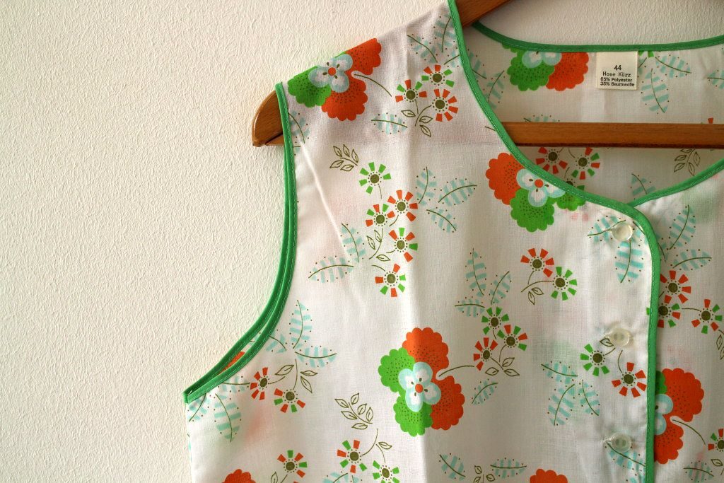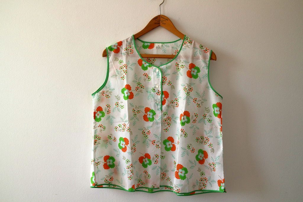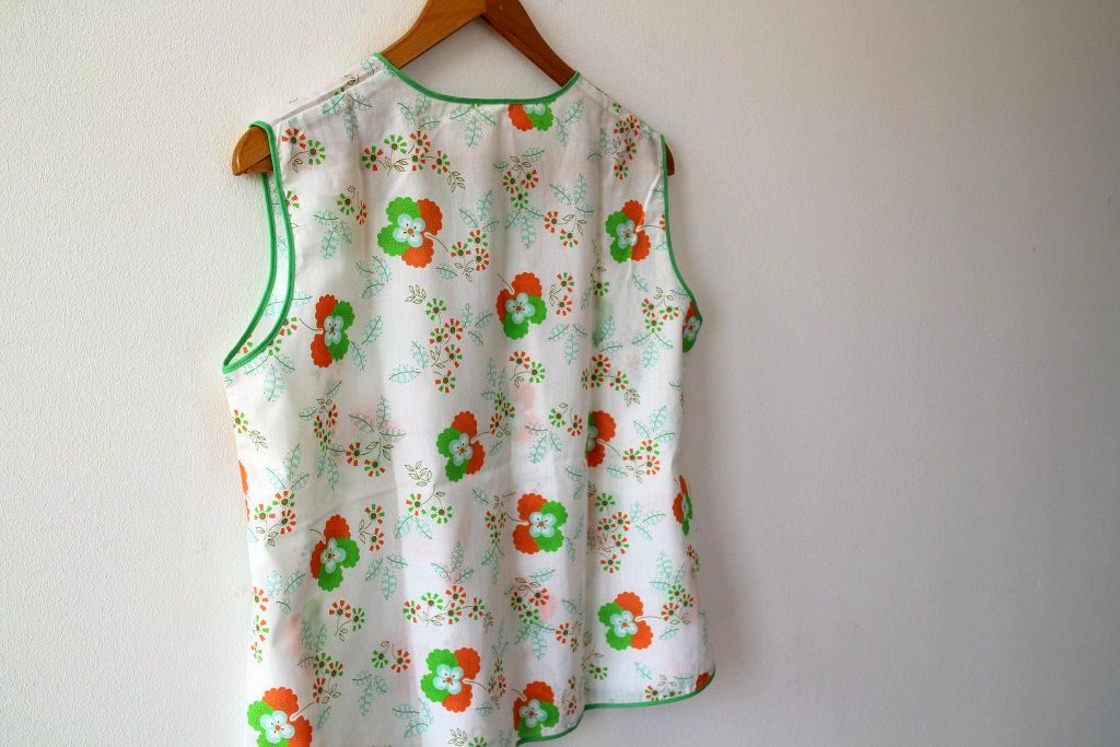 グリーンとオレンジのレトロな花模様が広がる、ヴィンテージ白色ノースリーブシャツ。 綿・ポリエステル混紡のさらりとした素材のフロントボタンスタイル。 緑のパイピングがキリリと効いた優しいデザインです。 ハンドメイドの材料にアレンジしてもグッド。