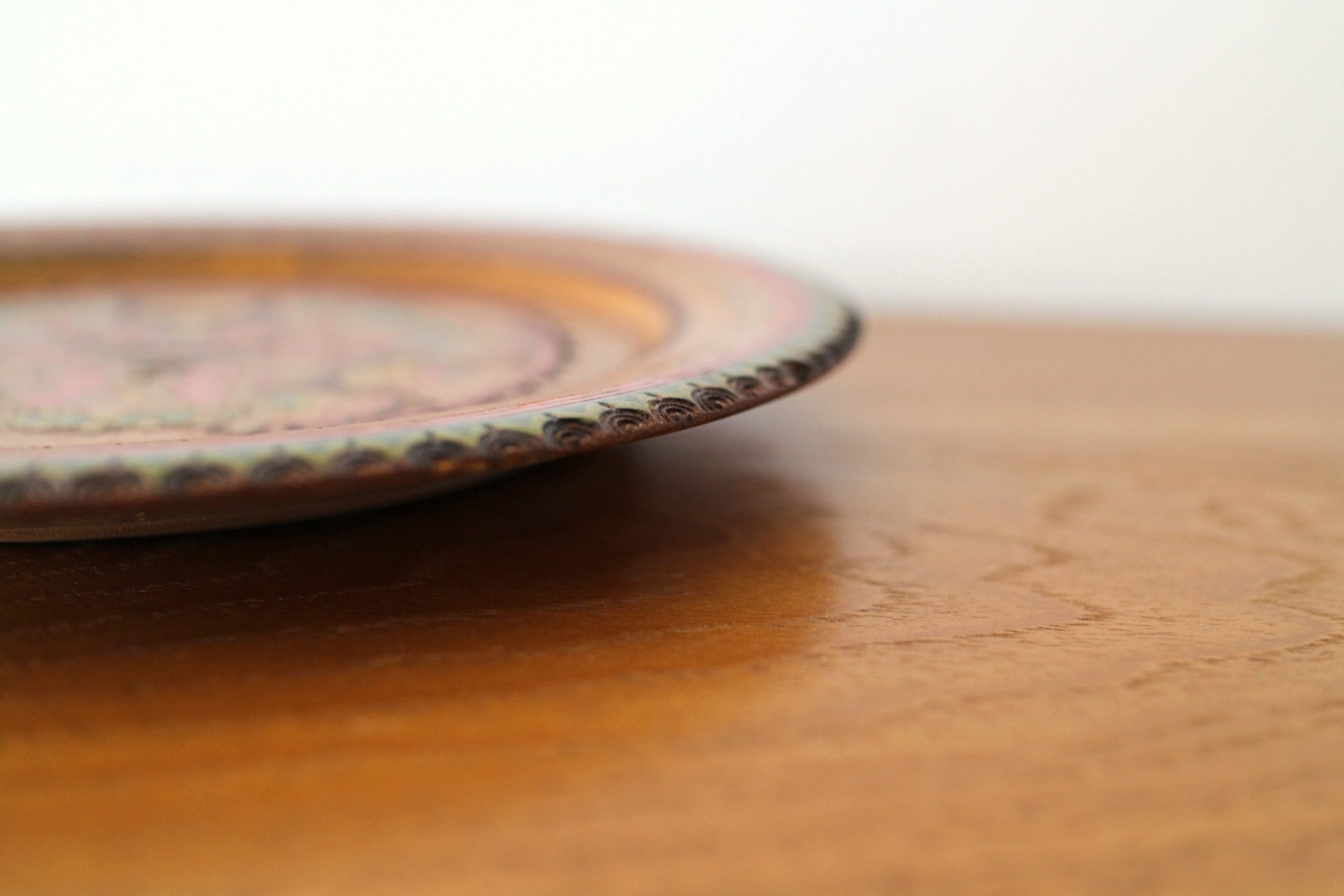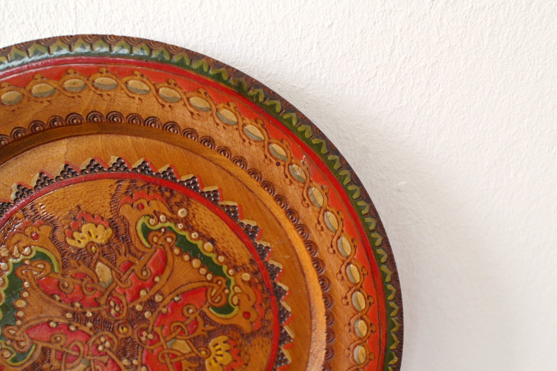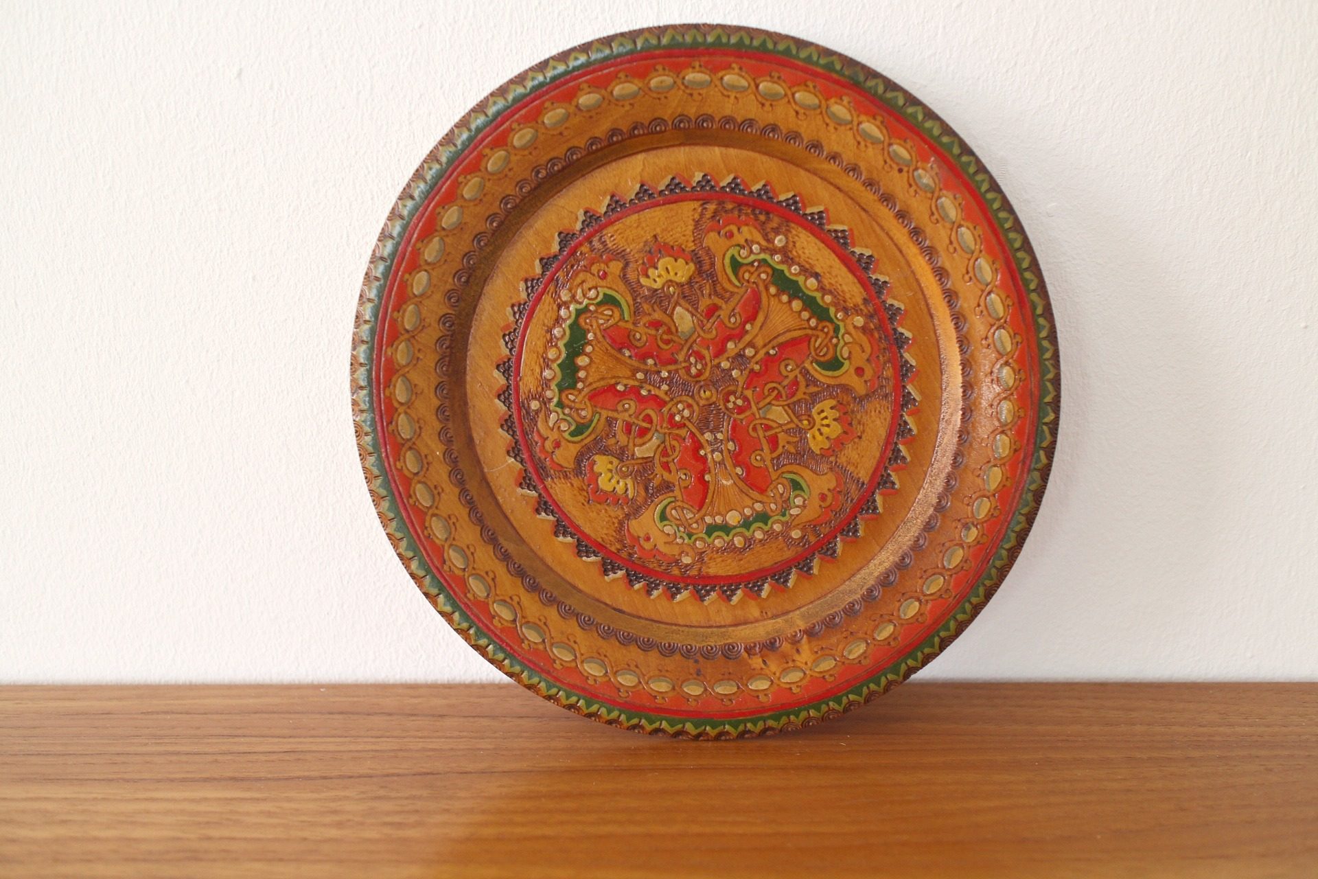 ロシアの民族調パターンが丁寧に彫り込まれた異国情緒あふれる木製ヴィンテージ絵皿。 共産国ならではの独特な朱色がポイント。 フックがついているので壁にかけて飾ることもできます。裏面にはロシア語ステッカー。 フォークロアな彩りをもたらすレトロなインテリア雑貨です。