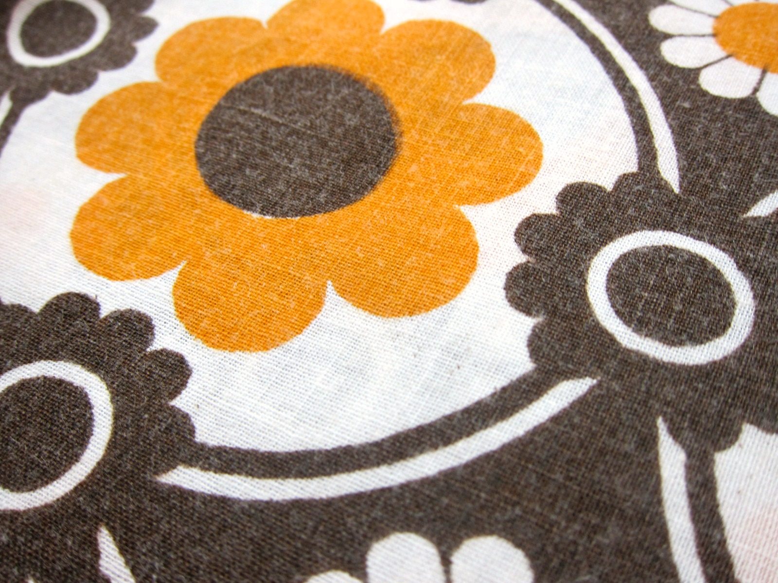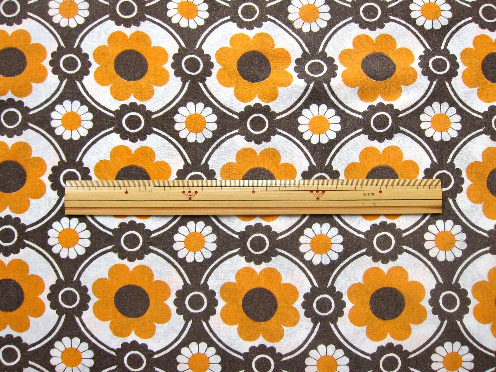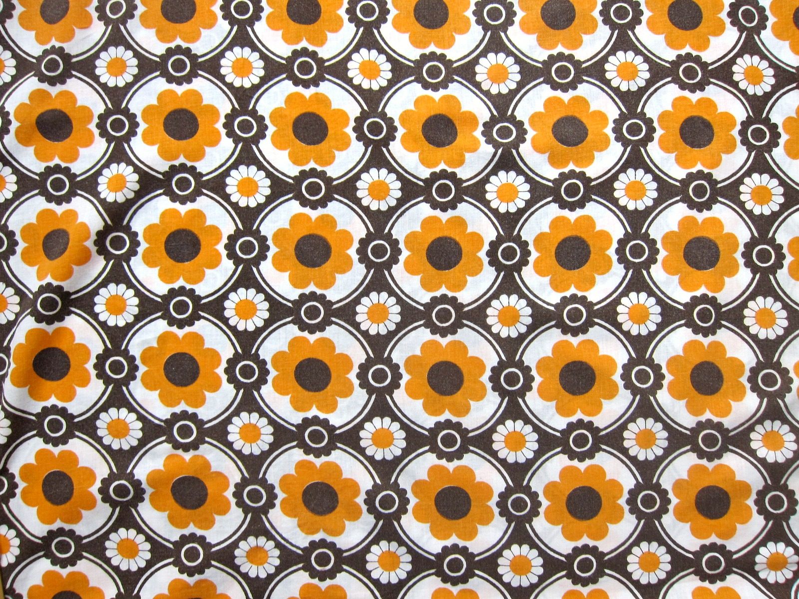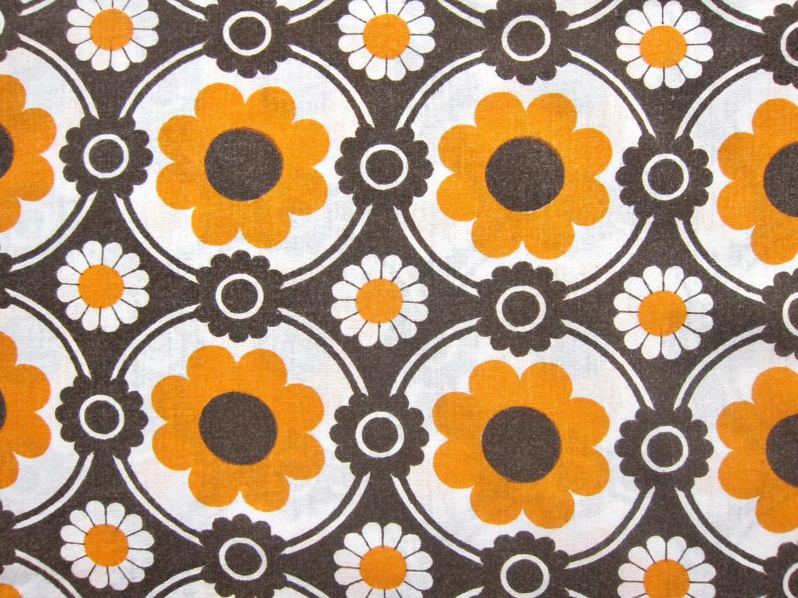 オレンジ色とブラウンのレトロな花柄ヴィンテージファブリック。 三種類のお花のモチーフが連続で描かれた、ノスタルジックなパターンです。