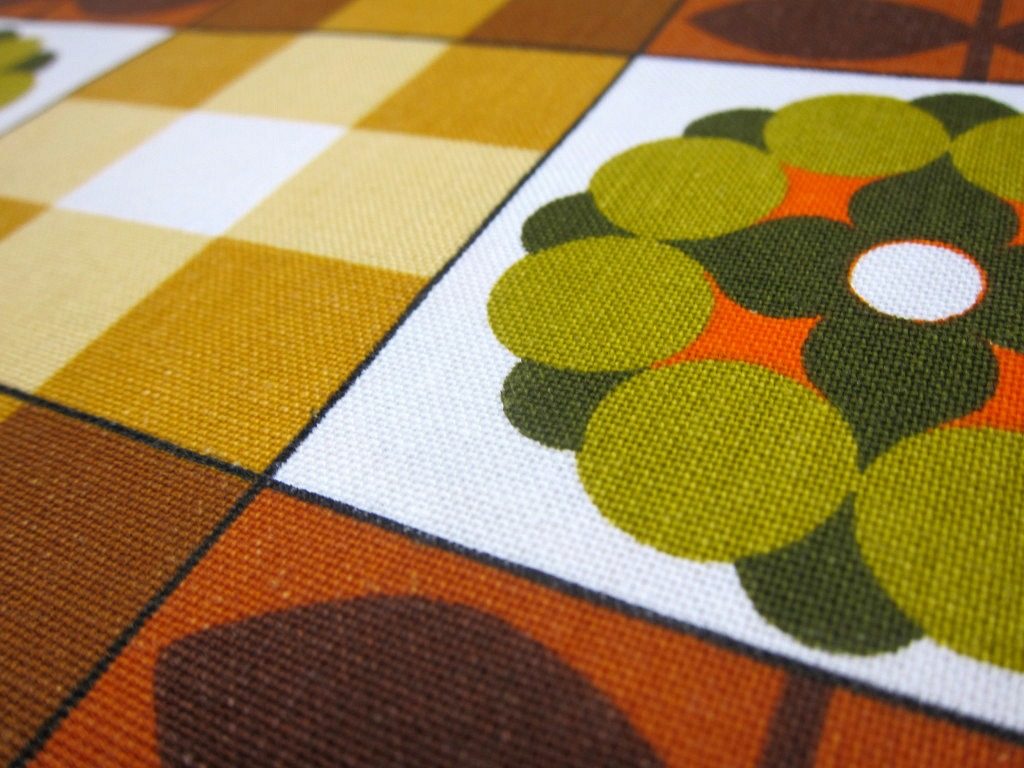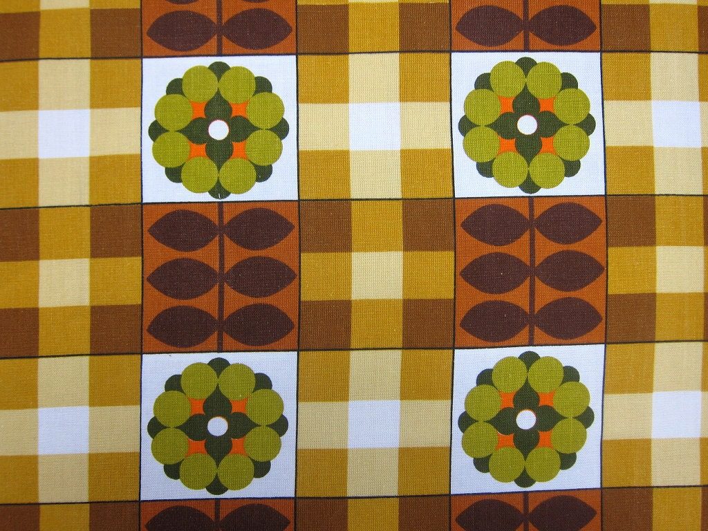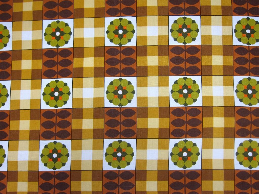 茶色のパターンに緑の花柄のレトロファブリック 幅105cm