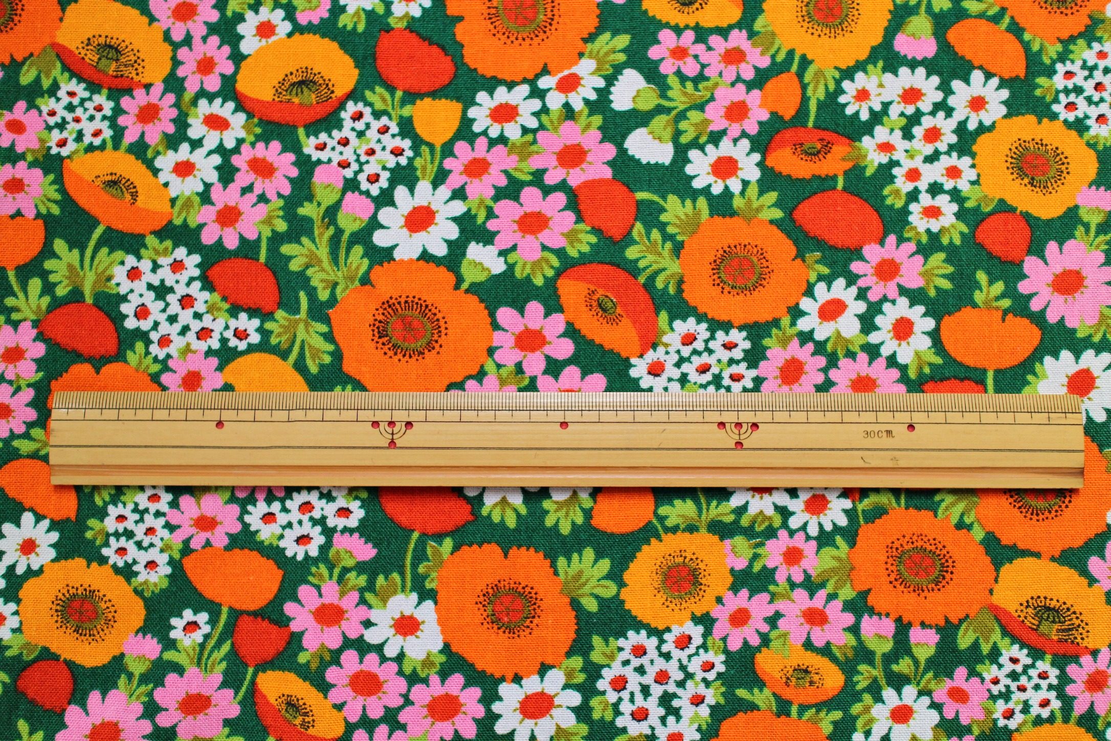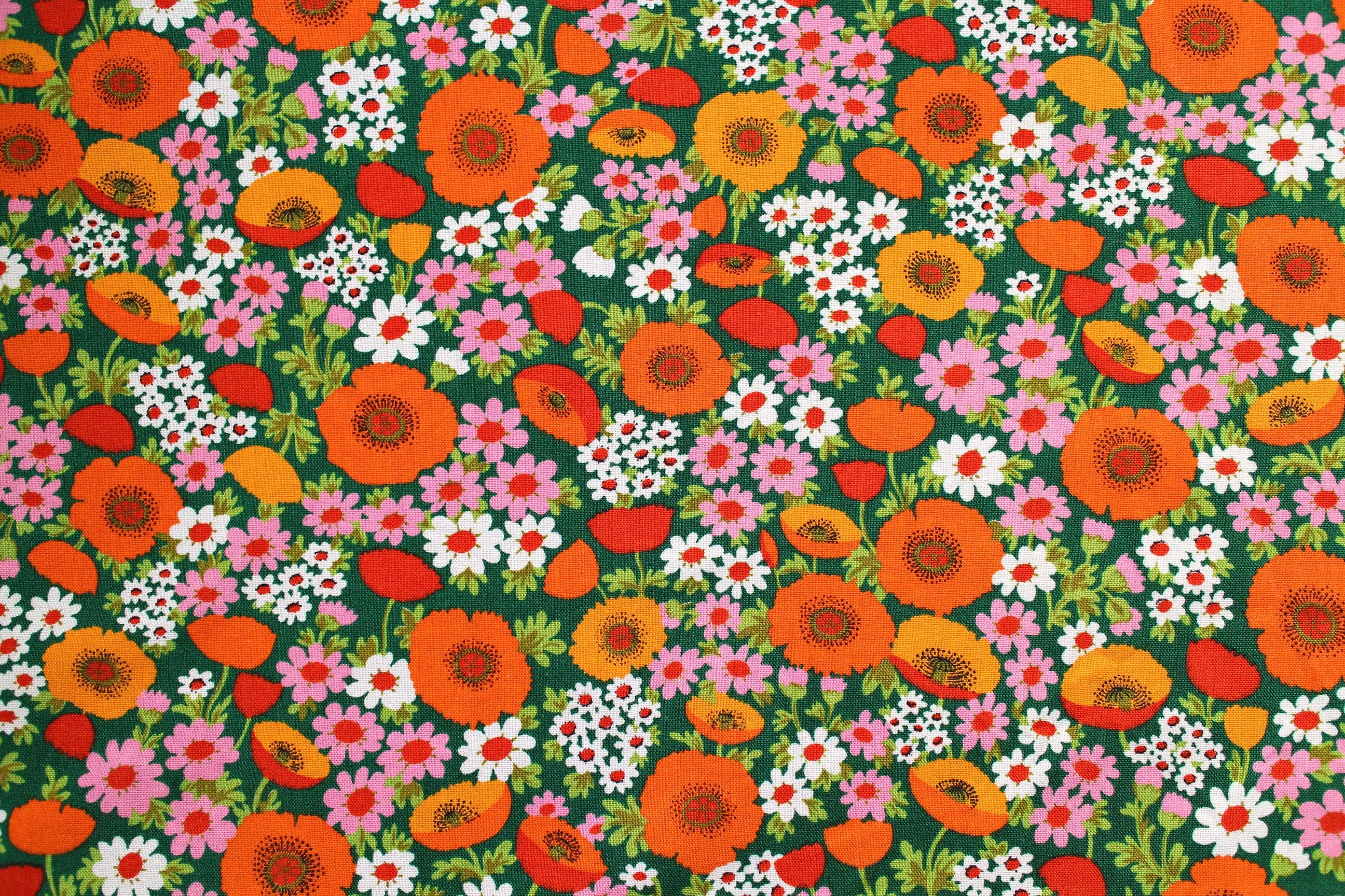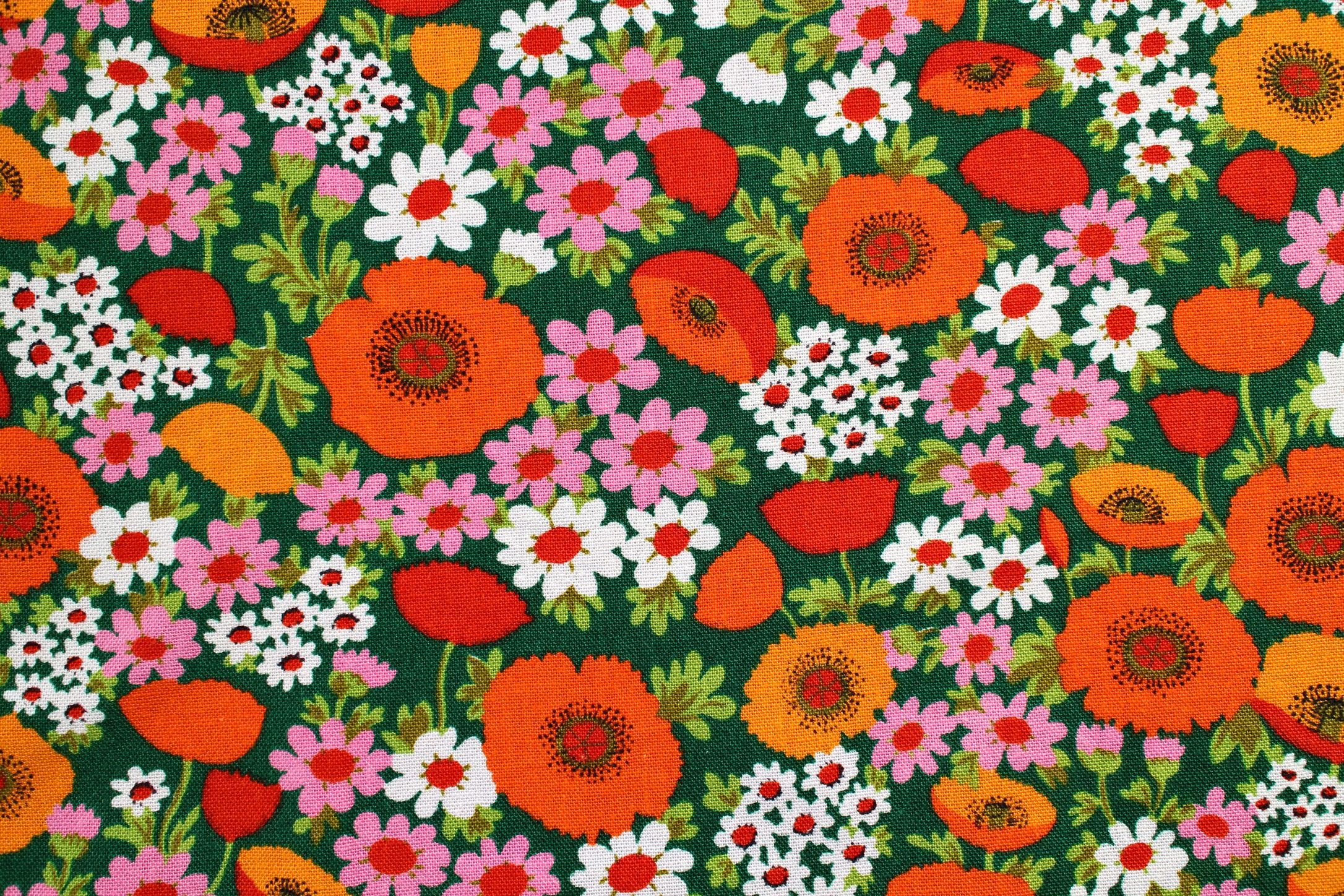 賑やかオレンジのポピーと、白&ピンクの野花がいっぱいに描かれた少し厚めの花柄ヴィンテージファブリック。 カラフルな花模様と地の深緑、レトロならではの絶妙なコントラストが印象的。 インテリア小物やバッグなどのファッション小物のリメイクにも最適な、しっかりとした厚手のコットン生地です。