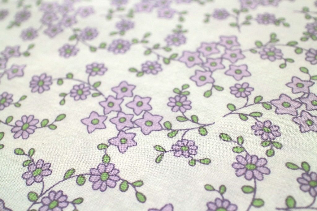 コンテンツにスキップ淡い藤色に彩られた小さなお花が舞う白色レトロ布。