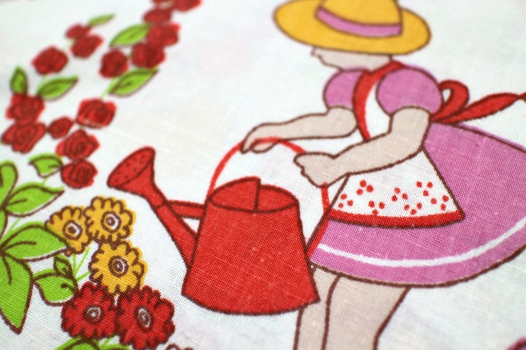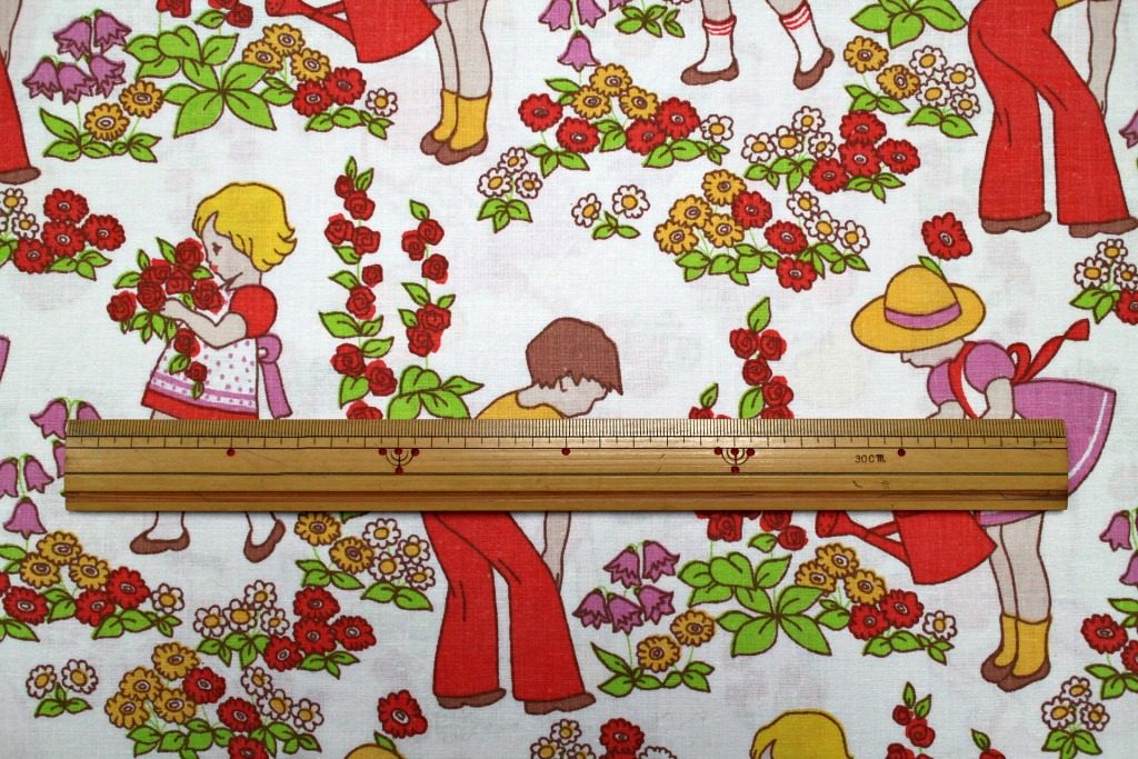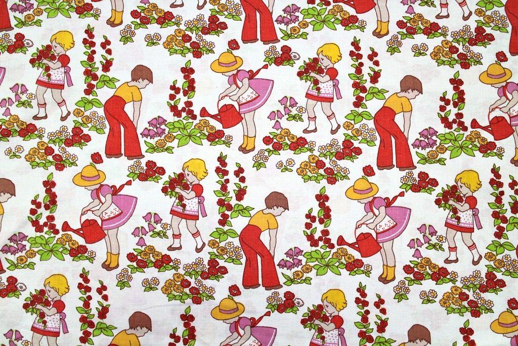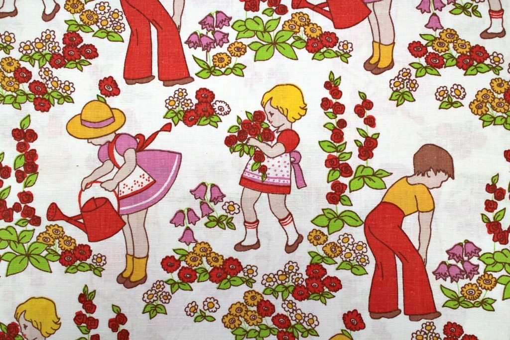 ガーデニングに勤しむ子どもたちやバラを抱えた少女など、乙女ごころがうずく可愛さいっぱいのイラストが嬉しいヴィンテージファブリック。