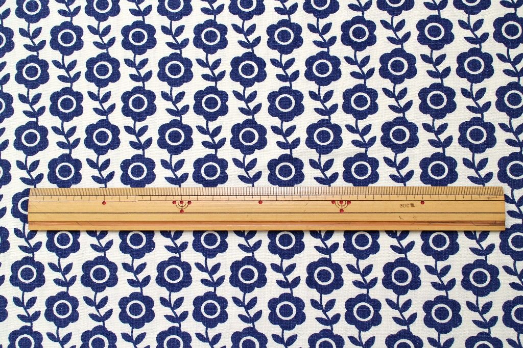 深いネイビーカラーのフラワーモチーフが生地いっぱいに連ねられたコットン製ヴィンテージファブリック。