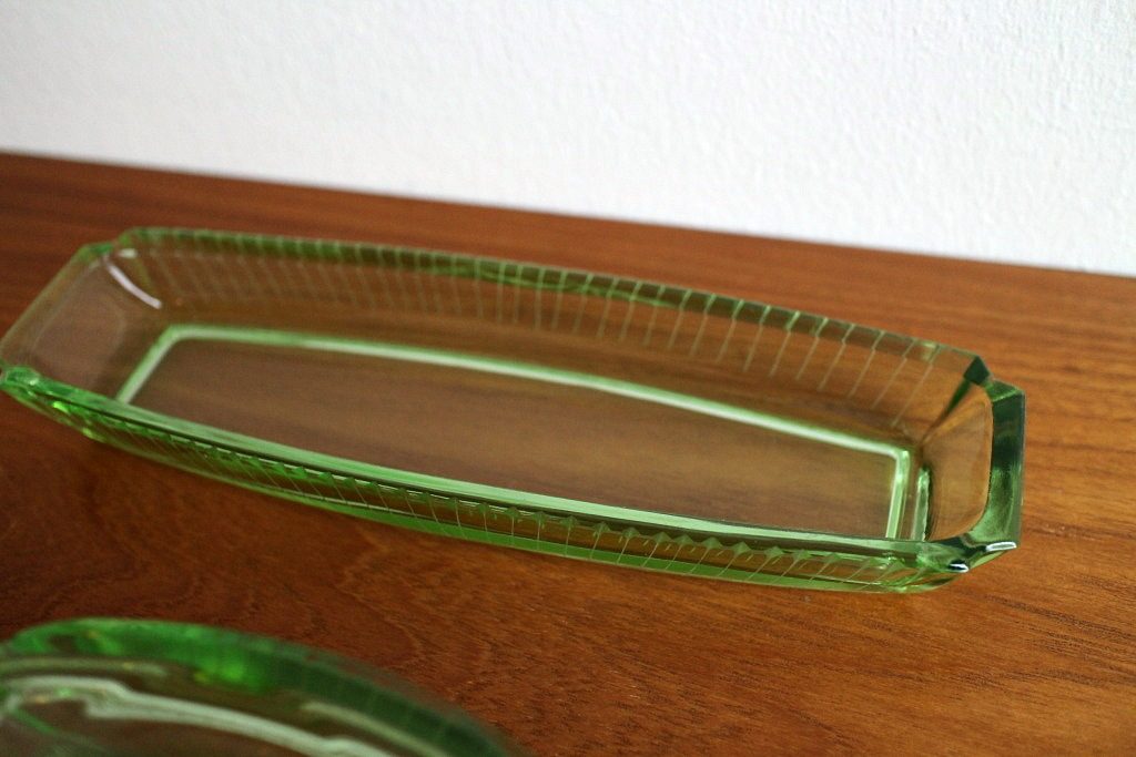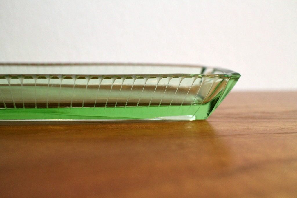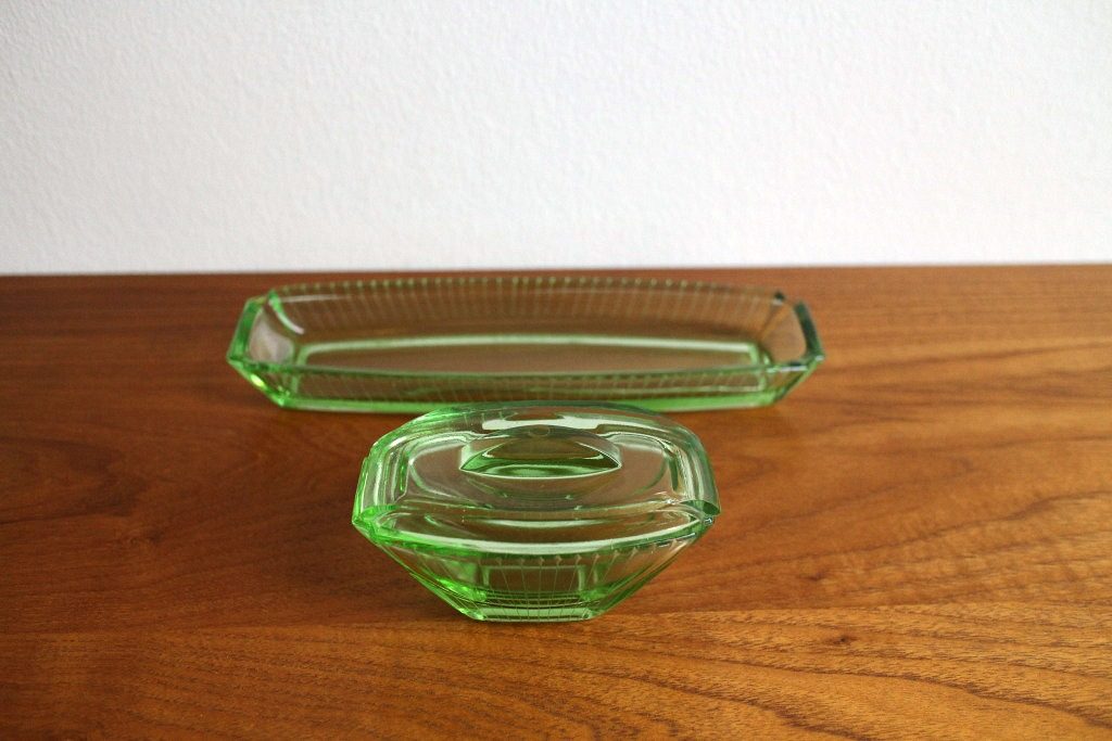 ベルリンの蚤の市で見つけた、気品のあるうっすらグリーンのガラス製小物入れ。