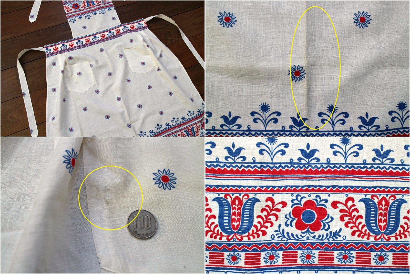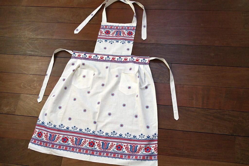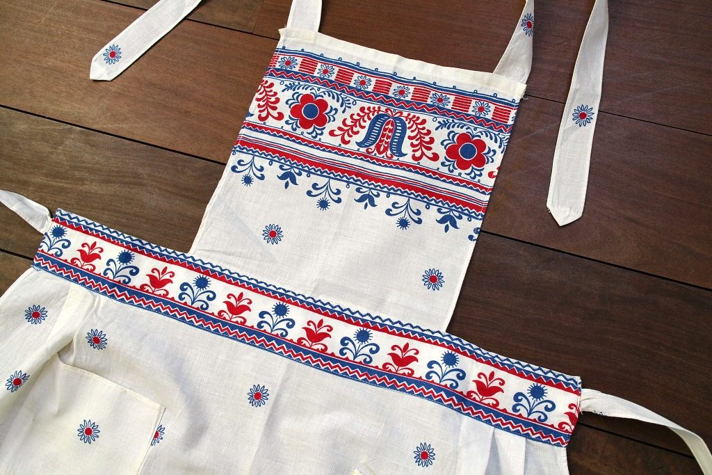 ブルー&レッドのフォークロアな花模様がいかにも東欧的なビンテージコットンエプロン。 腰ひもだけでなく首ひもも結ぶタイプのものなのでサイズ調整もバッチリです。 ささっと身につけるだけで一気にレトロ度がアップしますよ。 女性用サイズ。