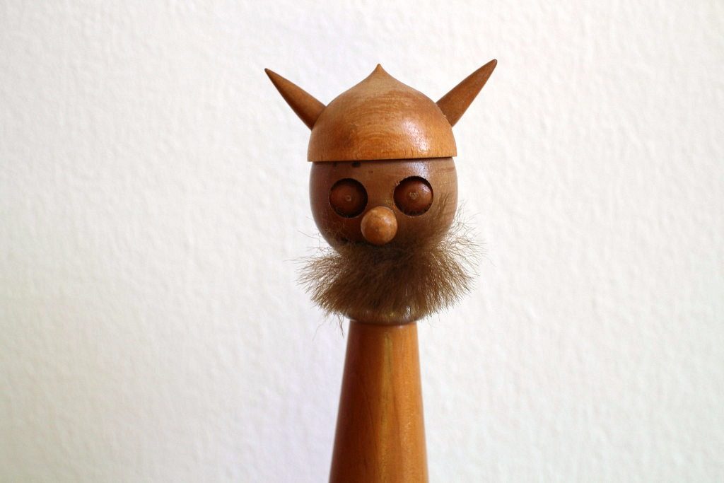 昔むかしのバイキングに見られるような角の生えたヘルメットとあごひげの、ワイルドさいっぱいの木製栓抜き。