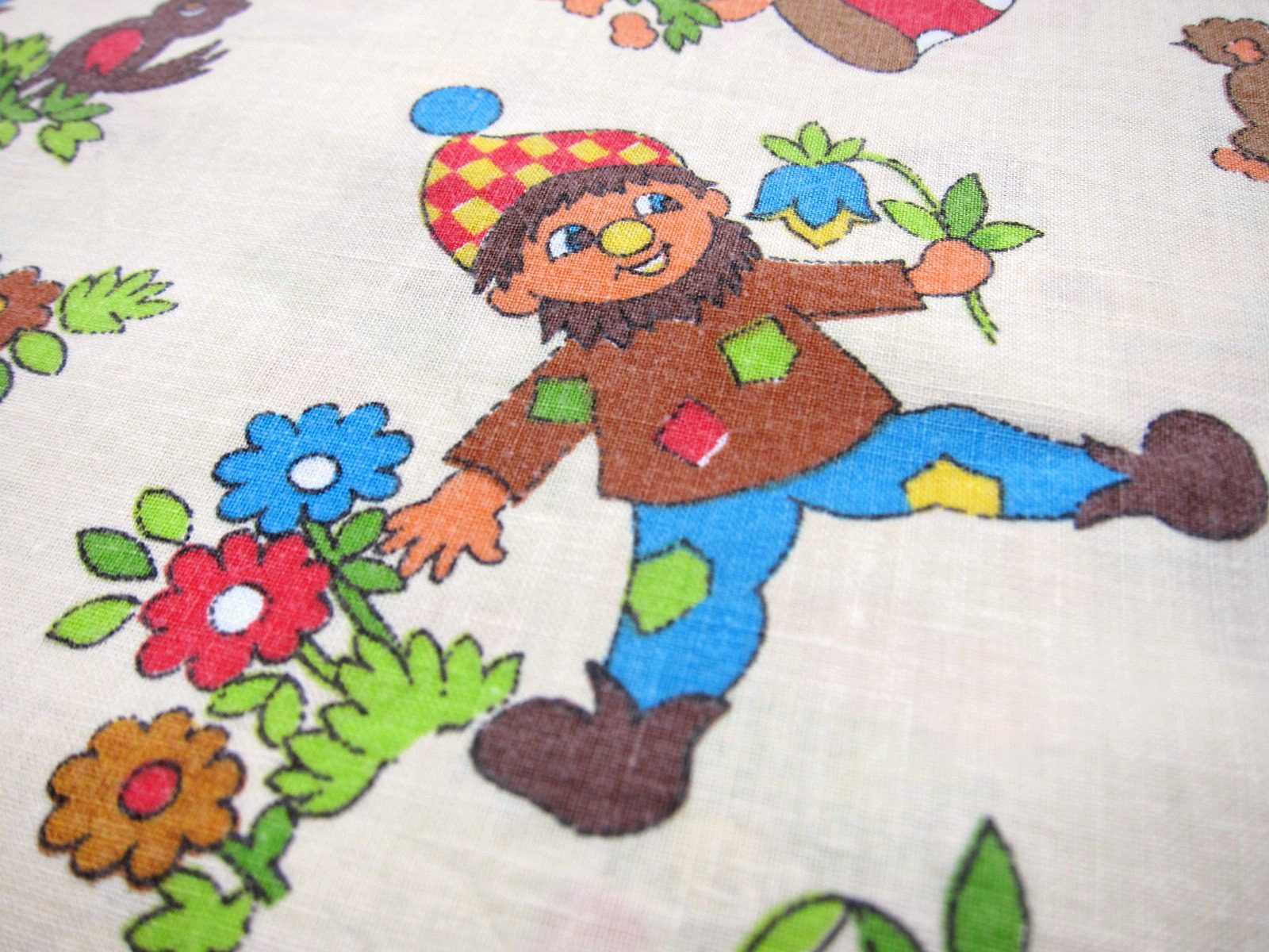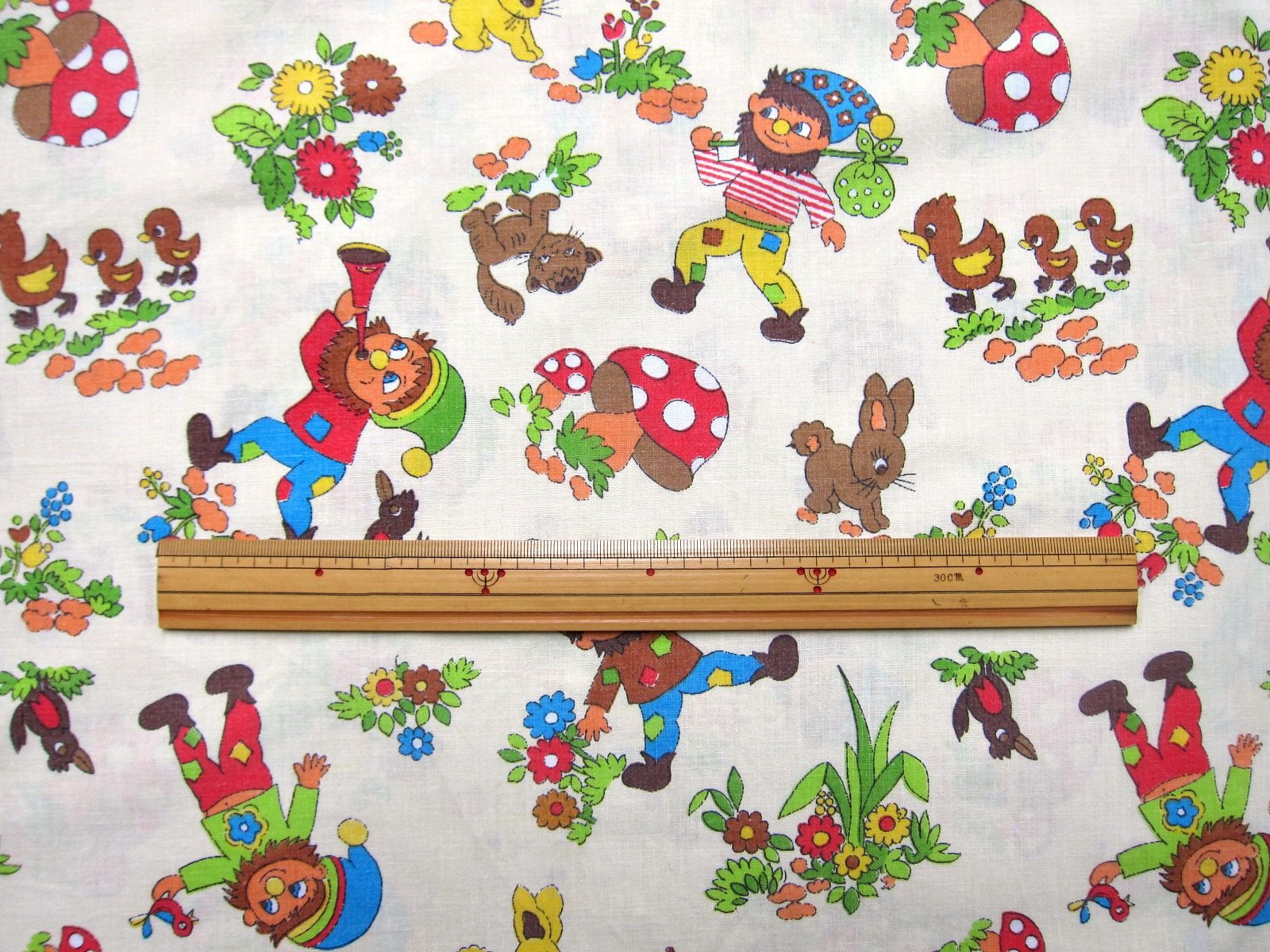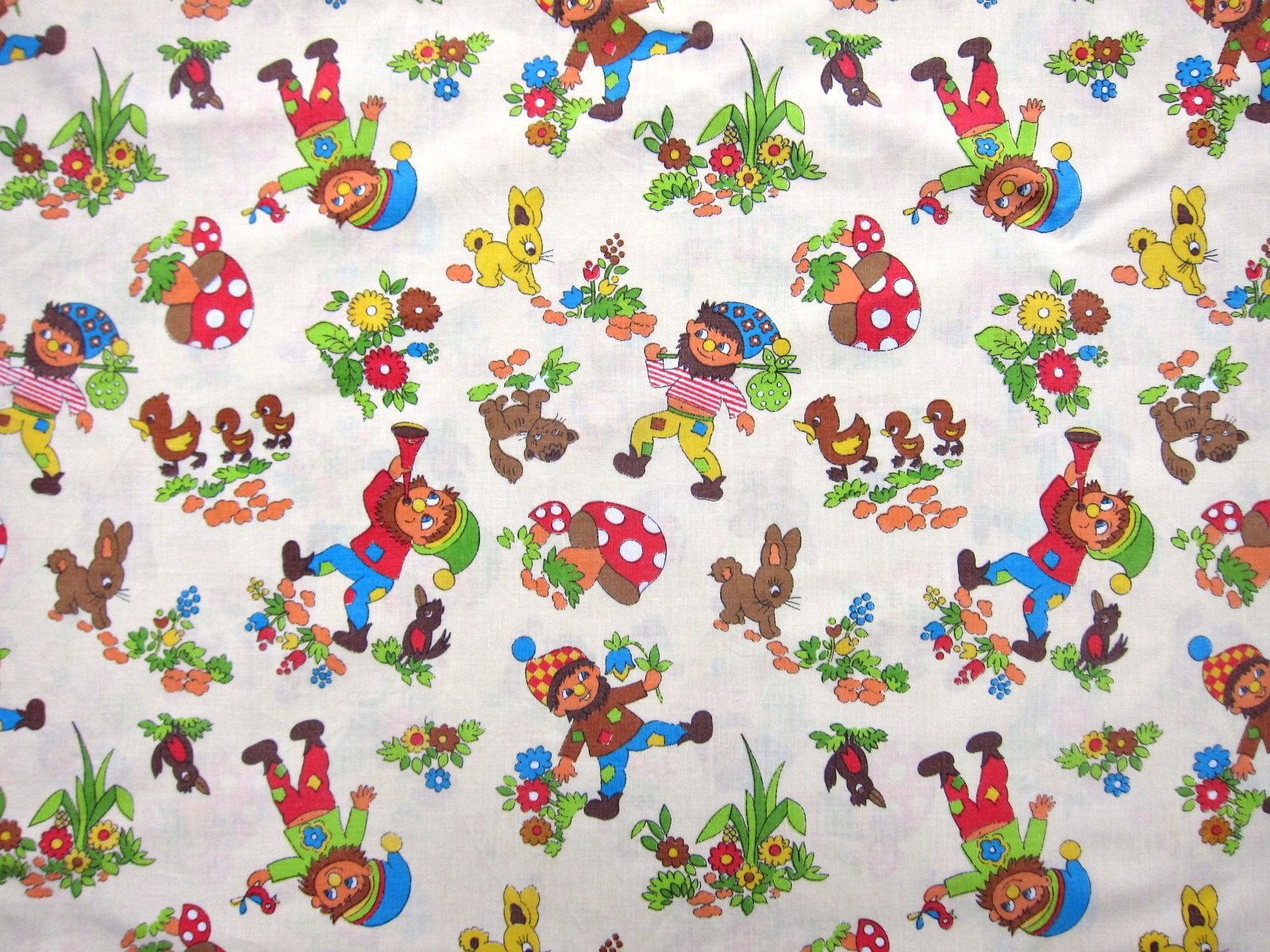 赤いキノコと、髭の生えた小人達のレトロで可愛らしいイラストが入った子ども柄ヴィンテージファブリック。
