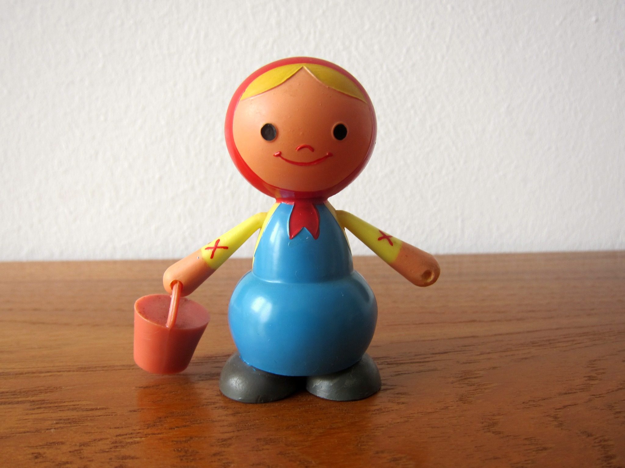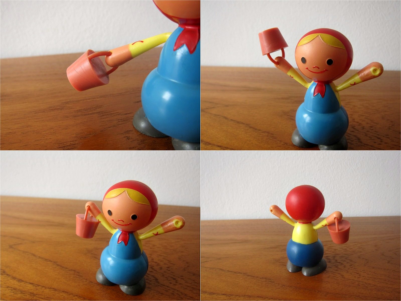 プラスティック製で、両手が上下に動くのと、手に持ったバケツの角度も変えられます。 両手を上げた時のおてんばな感じが微笑ましいですね。 元気をもらえるインテリアとしていかがでしょうか。