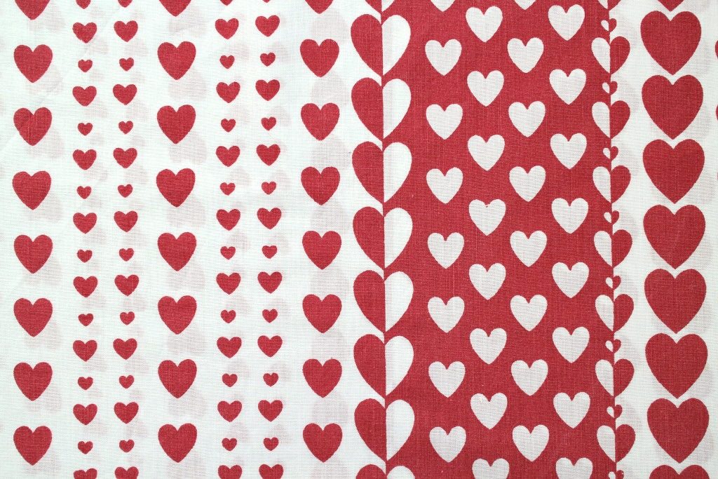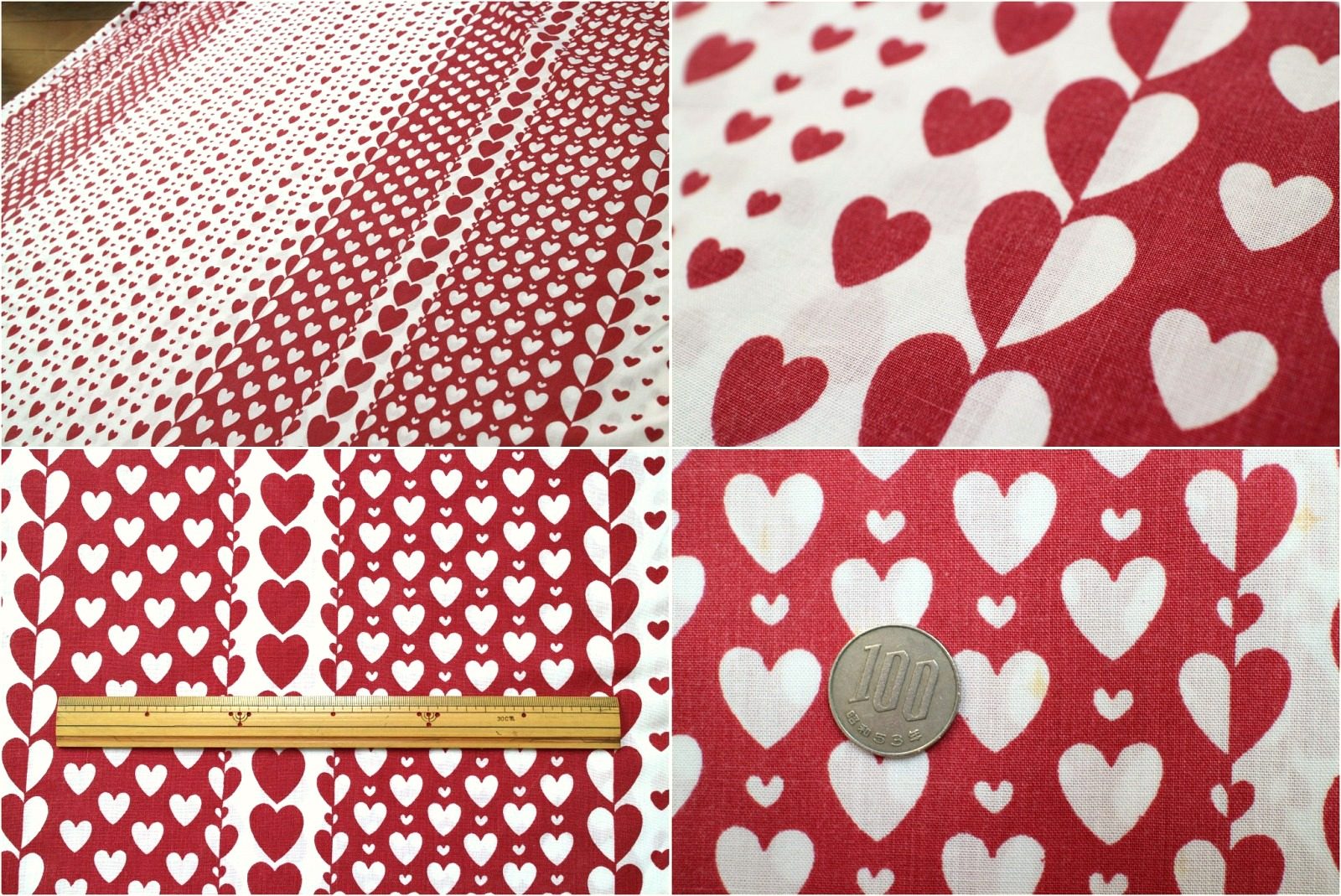 コンテンツにスキップ無限に並んだ白抜きハートと赤抜きハートが圧巻な個性いっぱいヴィンテージファブリック。