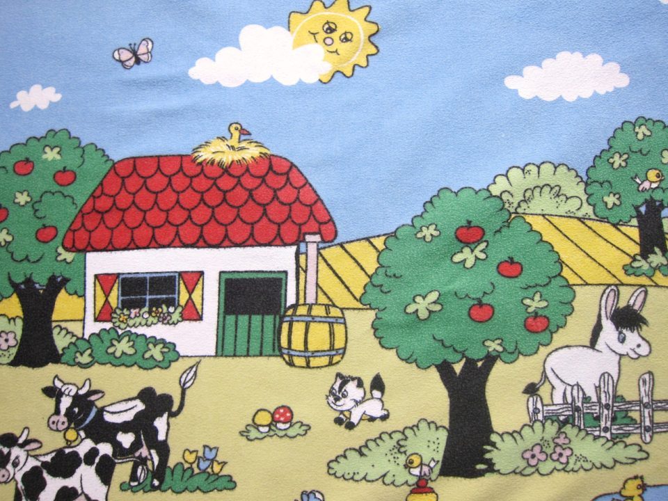 牛や馬、ブタ、ニワトリ、小屋、木などが元気に描かれたドイツのヴィンテージファブリック。 生地いっぱいに農場の様子が描かれています。