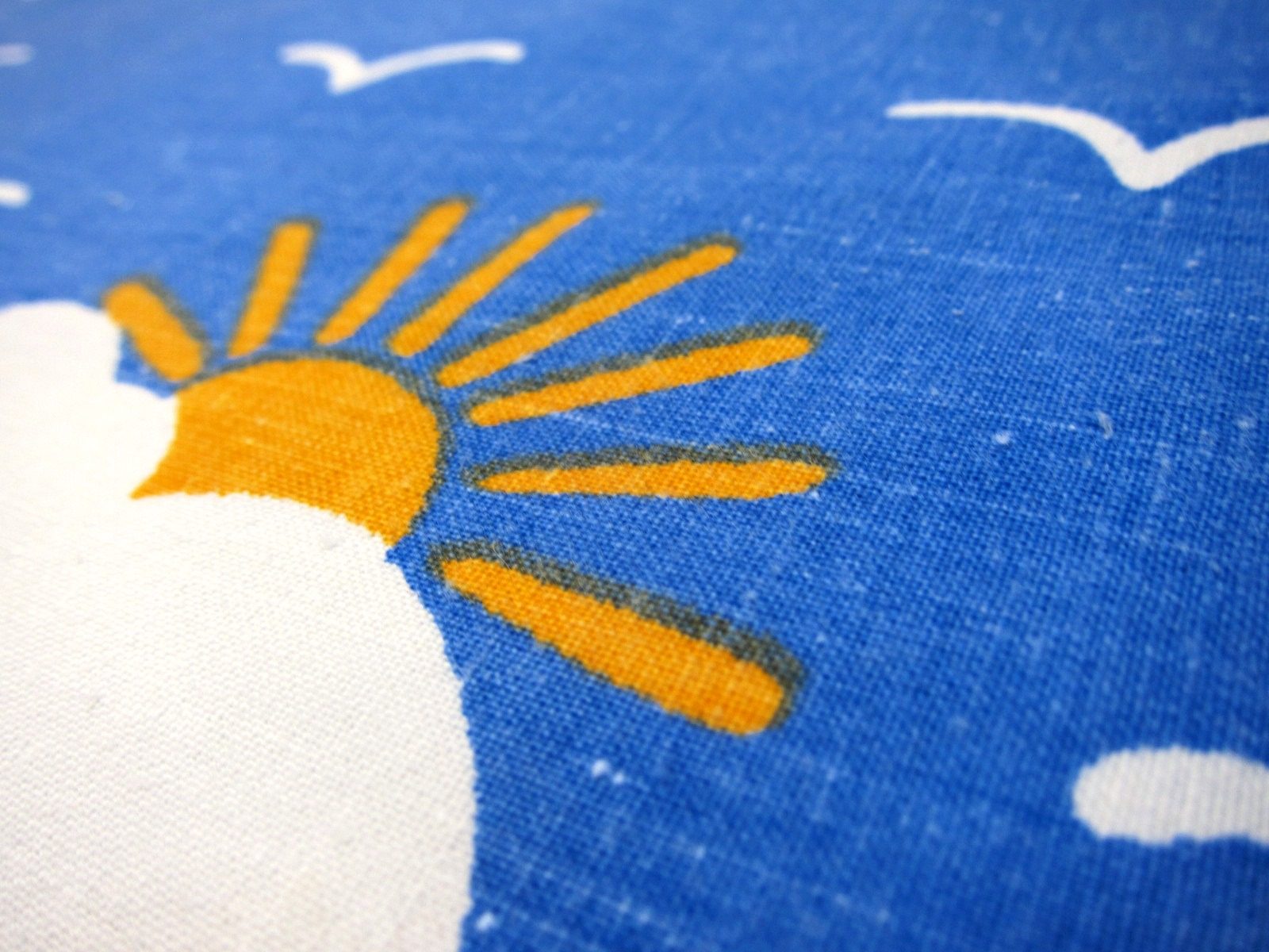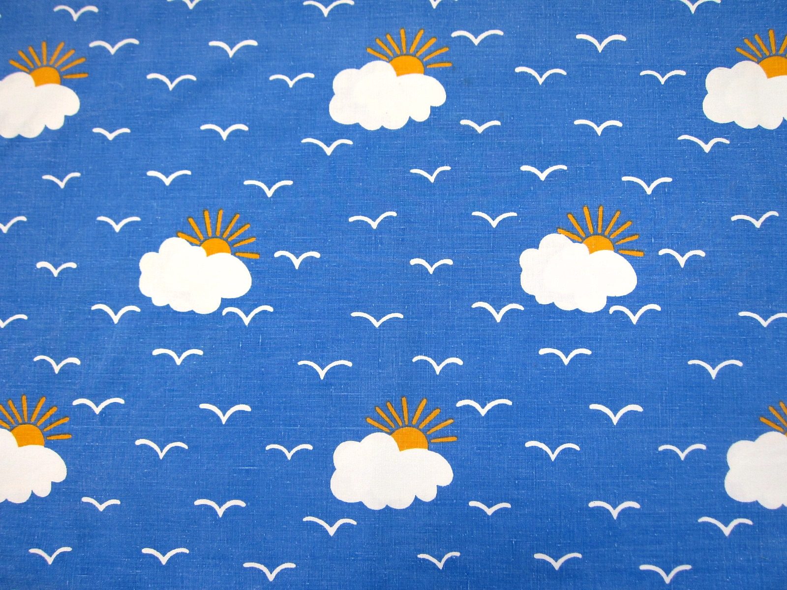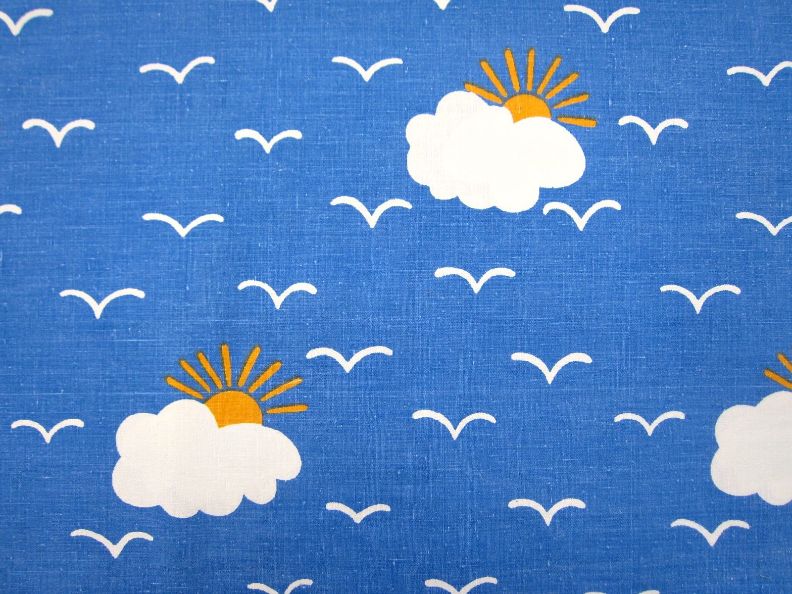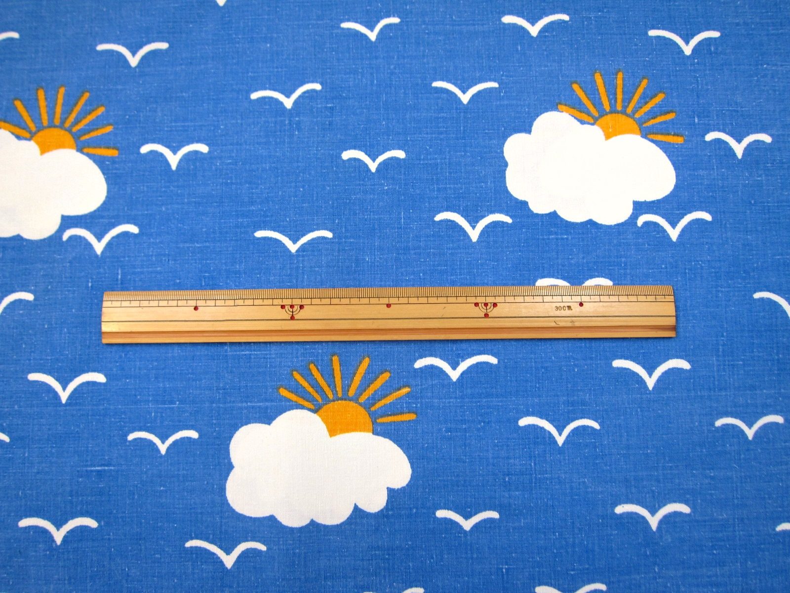 青い空に、太陽、雲、そしてかもめのモチーフが入ったレトロファブリック。 海を連想させるような子ども柄生地です。