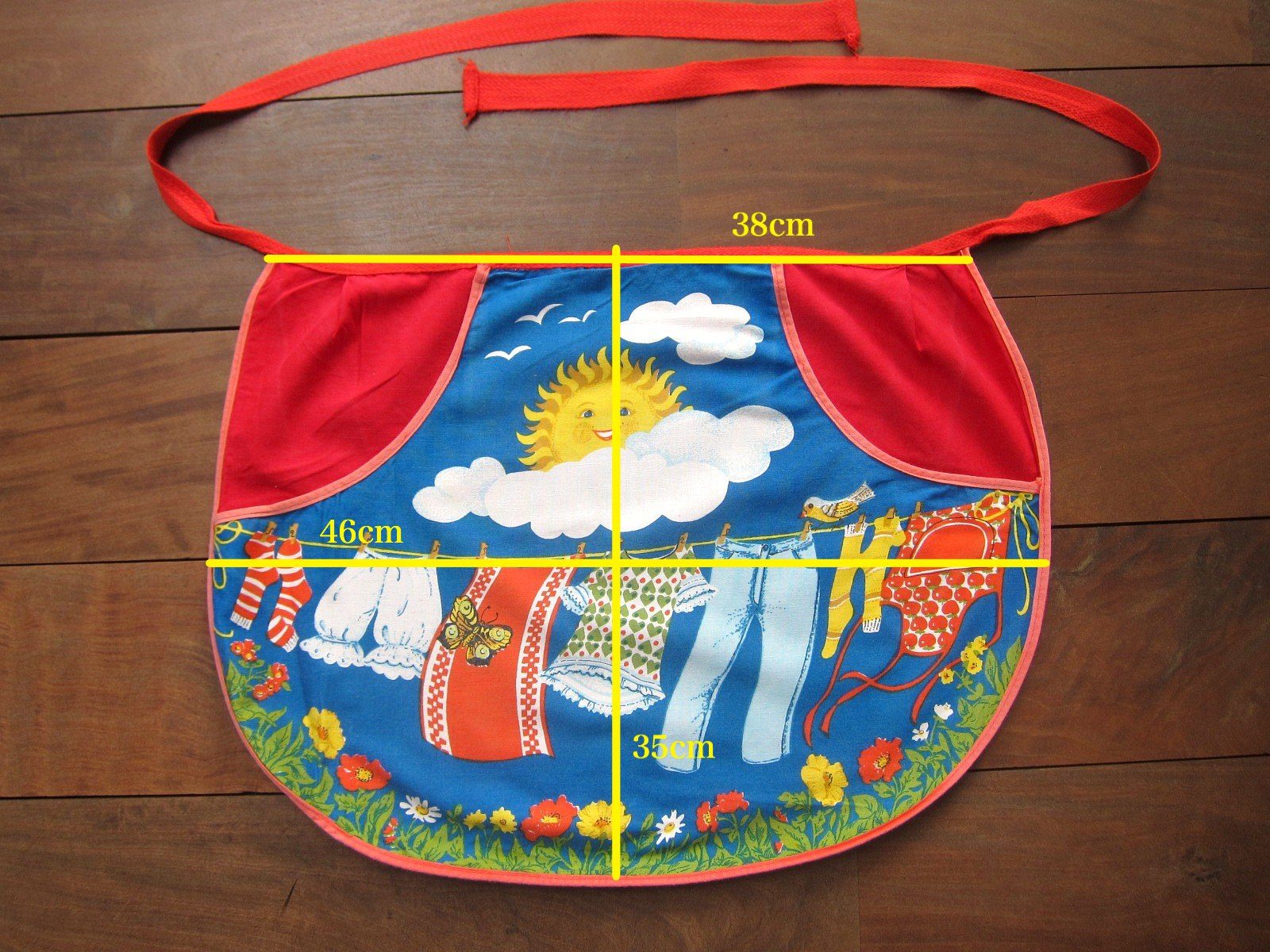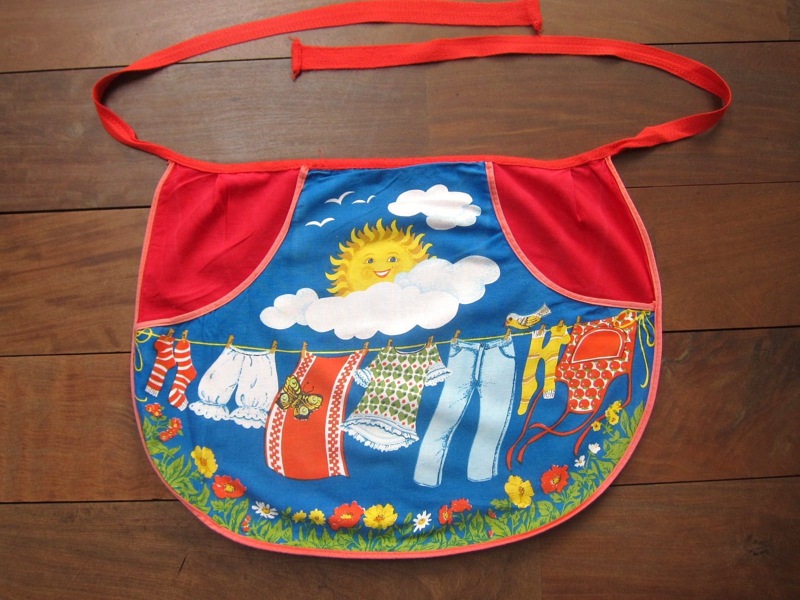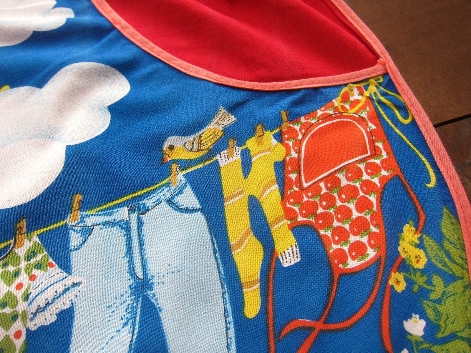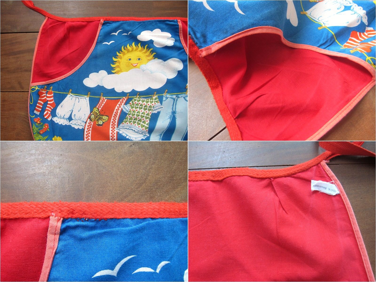 光り輝く太陽のもと洗濯物が風になびく様子が鮮やかに描かれた、70年代ヴィンテージエプロン(前掛けタイプ)。 ワクワクしてしまう楽しいデザインと、ブルーxレッドのビビッドな配色がレトロ感たっぷり。