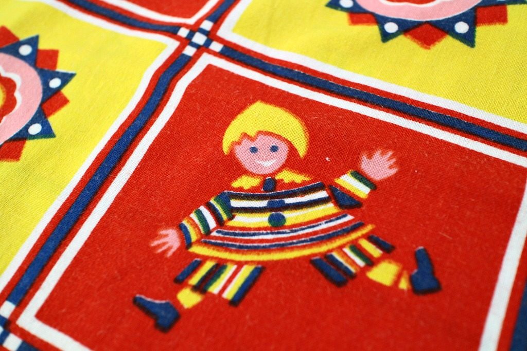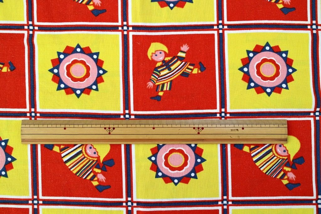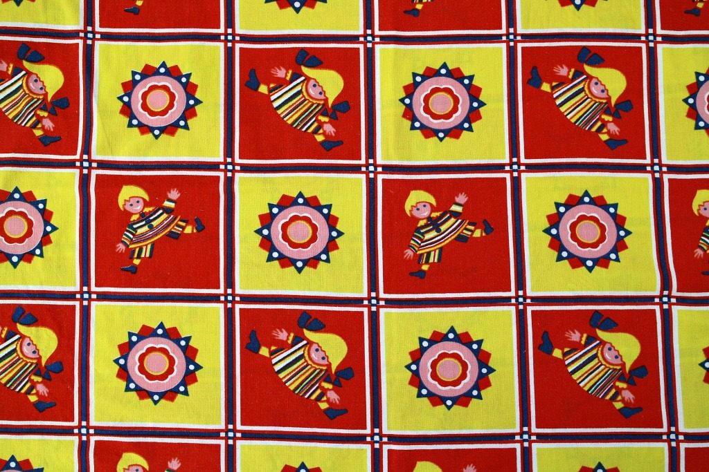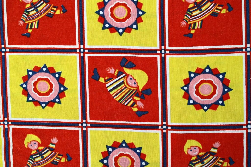 黄色いパネルにはシンボル化されたフォークロアなお花モチーフ、赤いパネルには両手両足を広げた躍動感あふれる男の子と女の子が描かれています。