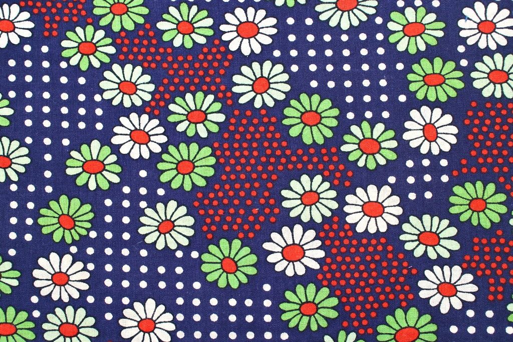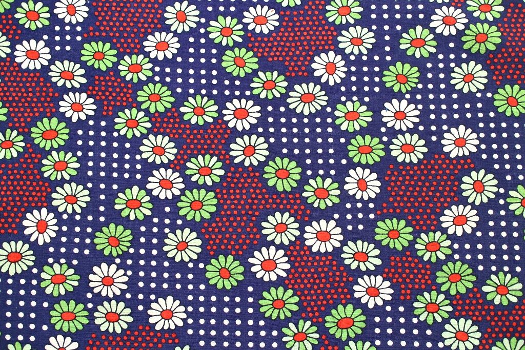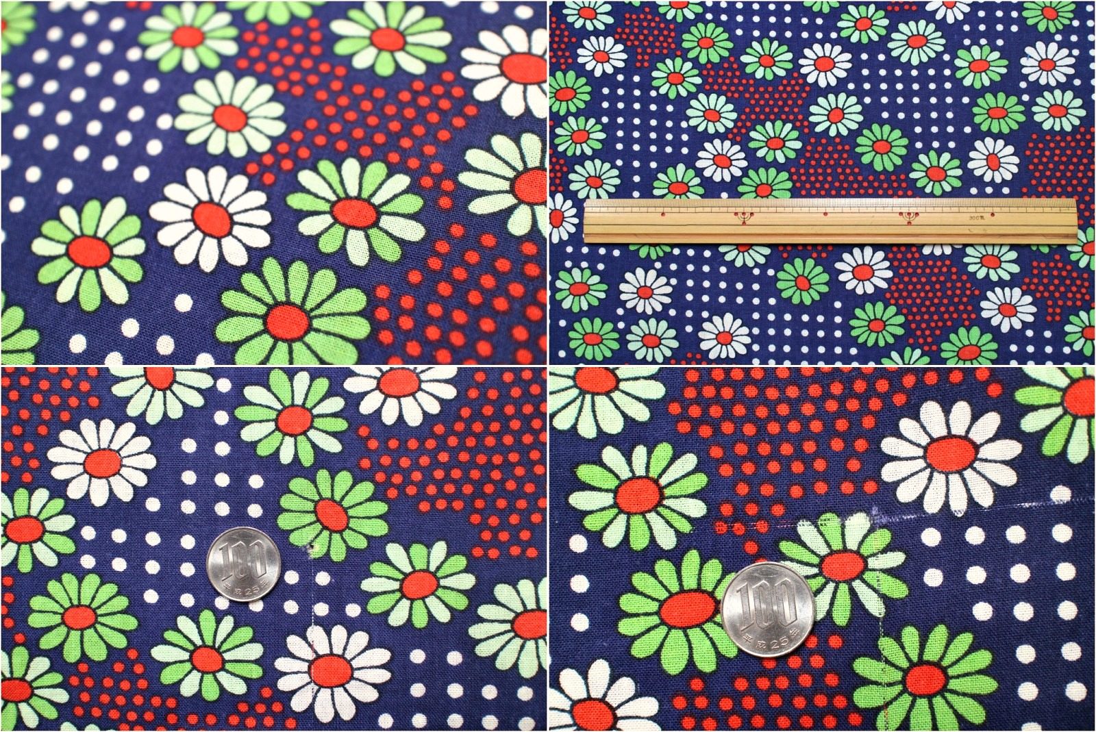 黄緑デイジーとドットの懐かしさあふれる紺色ビンテージ生地 幅72cm