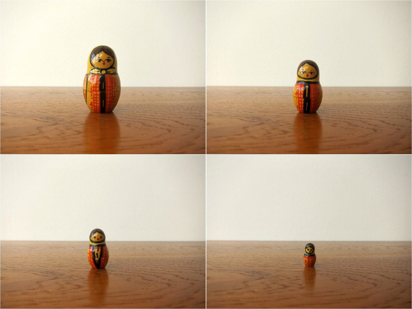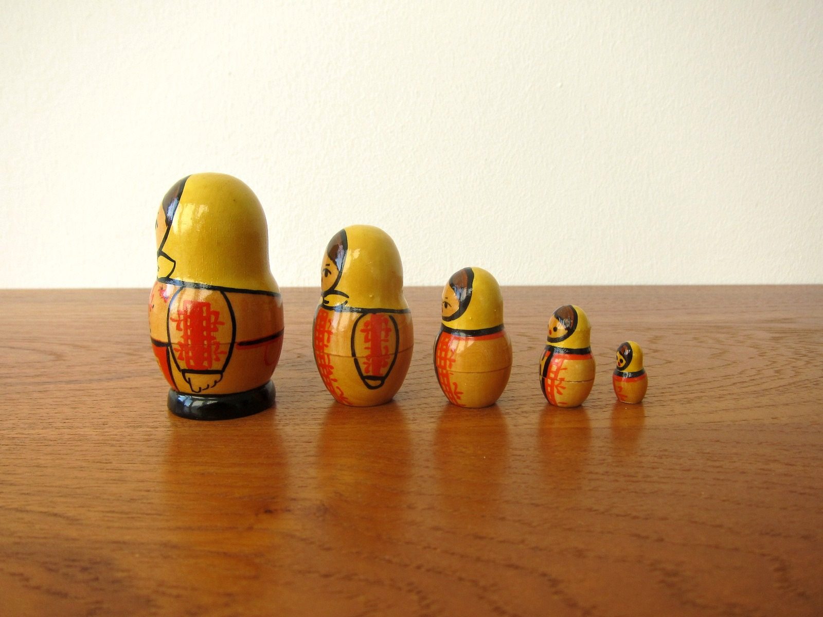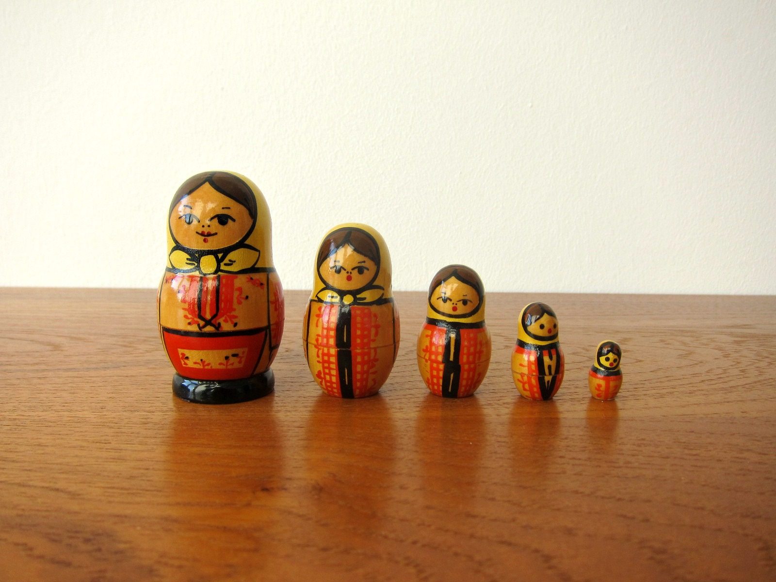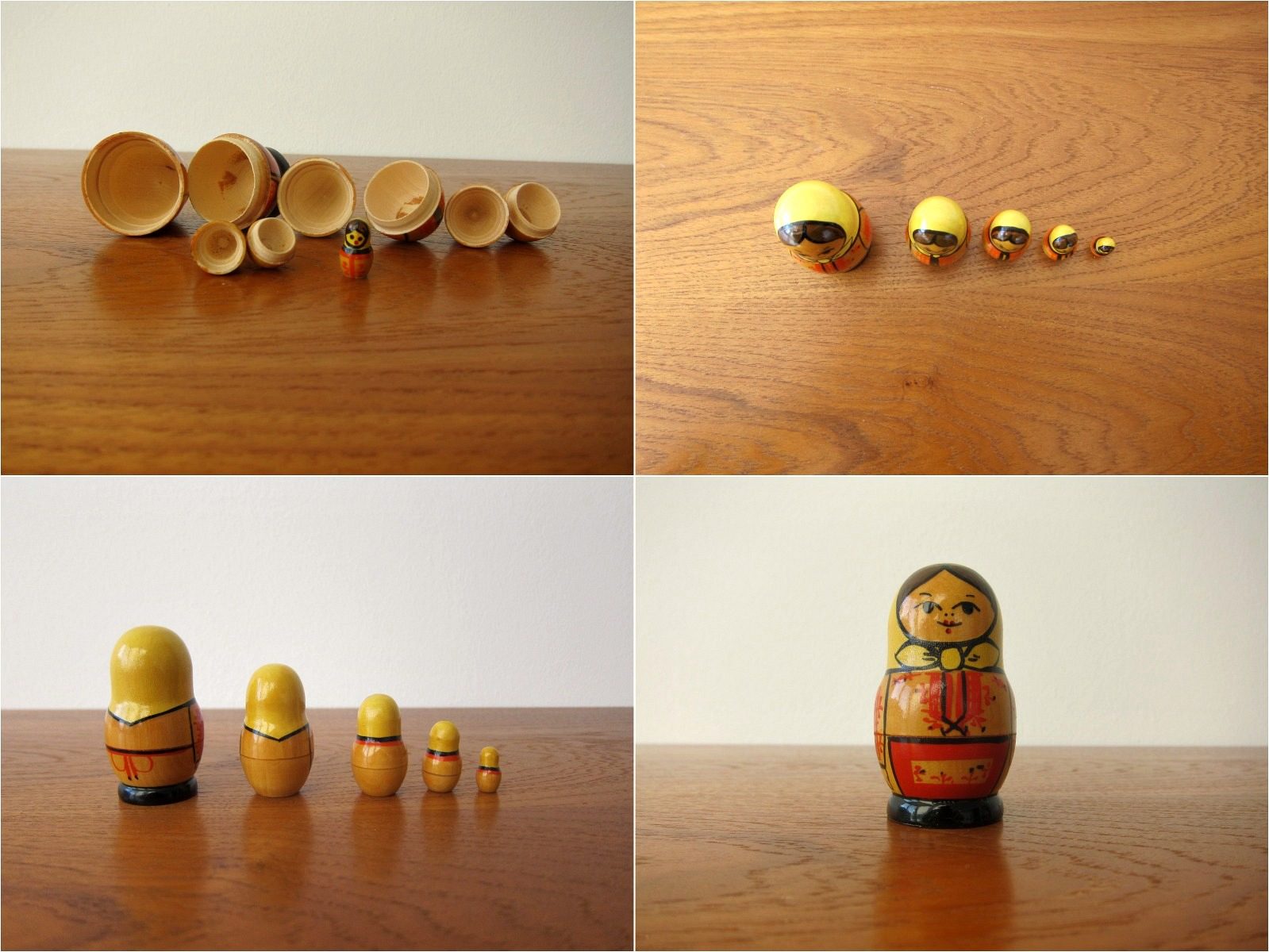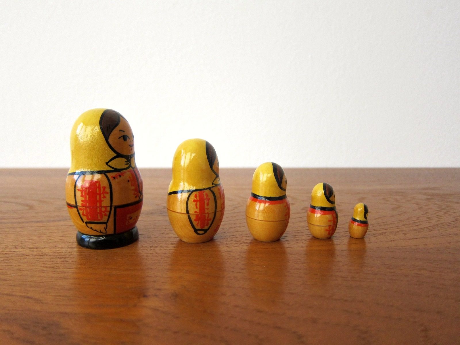 ぷっくりした体型をしたマトリョーシカ、5体入り。 黄色い頭巾と赤い服を着た、色使いの少ないシンプルな木製のお人形です。