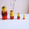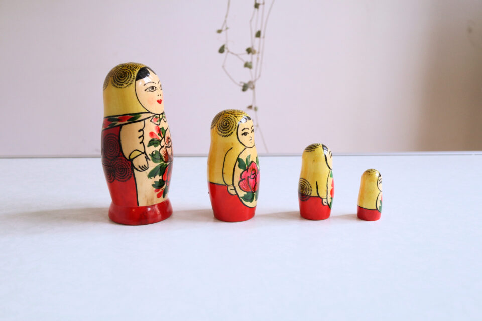 赤い民族衣装に黄色いショールをまとった、ロシアらしい色合いのビンテージマトリョーシカ4姉妹。 衣装デザインや手に持つ花がそれぞれ異なる、手の込んだ作りとなっています。