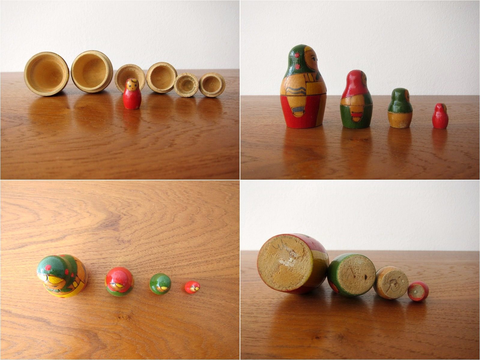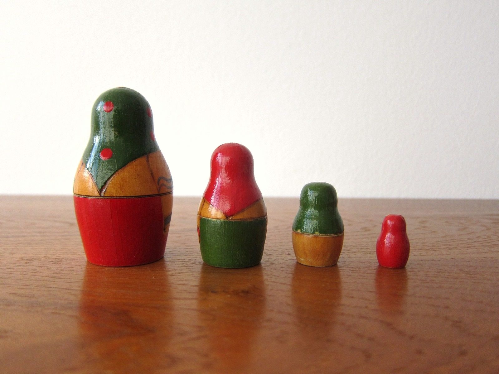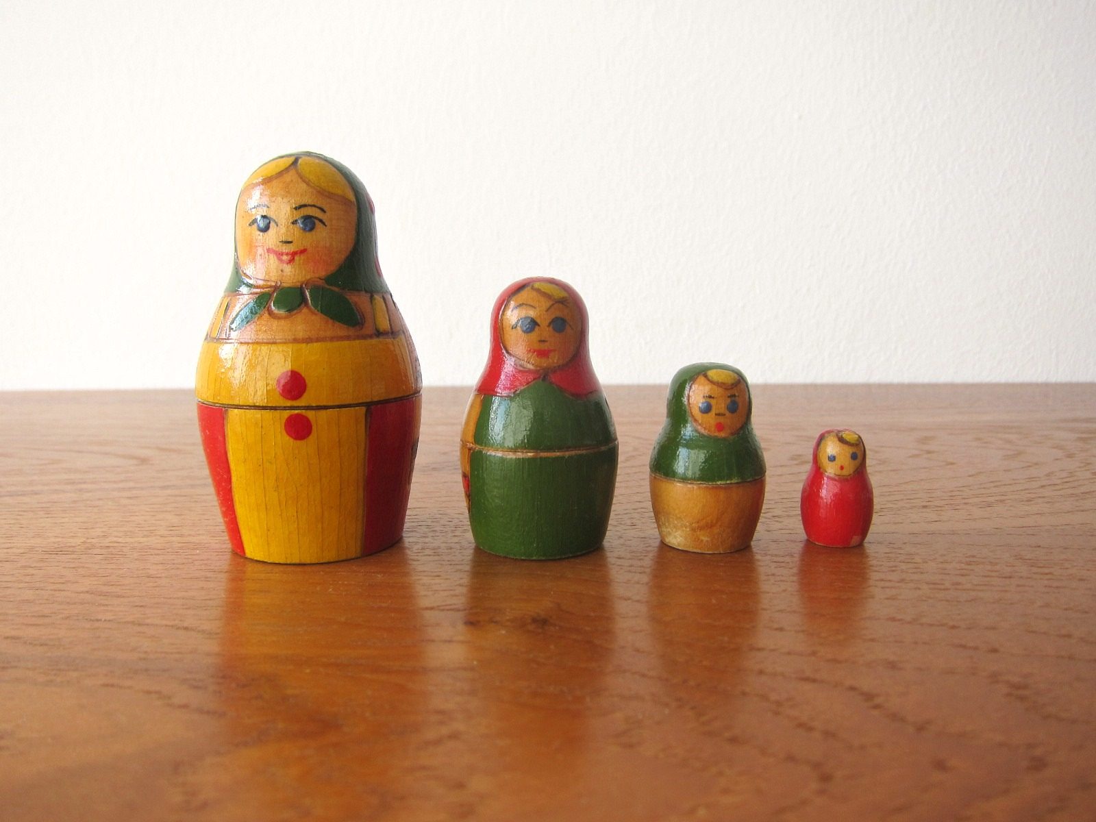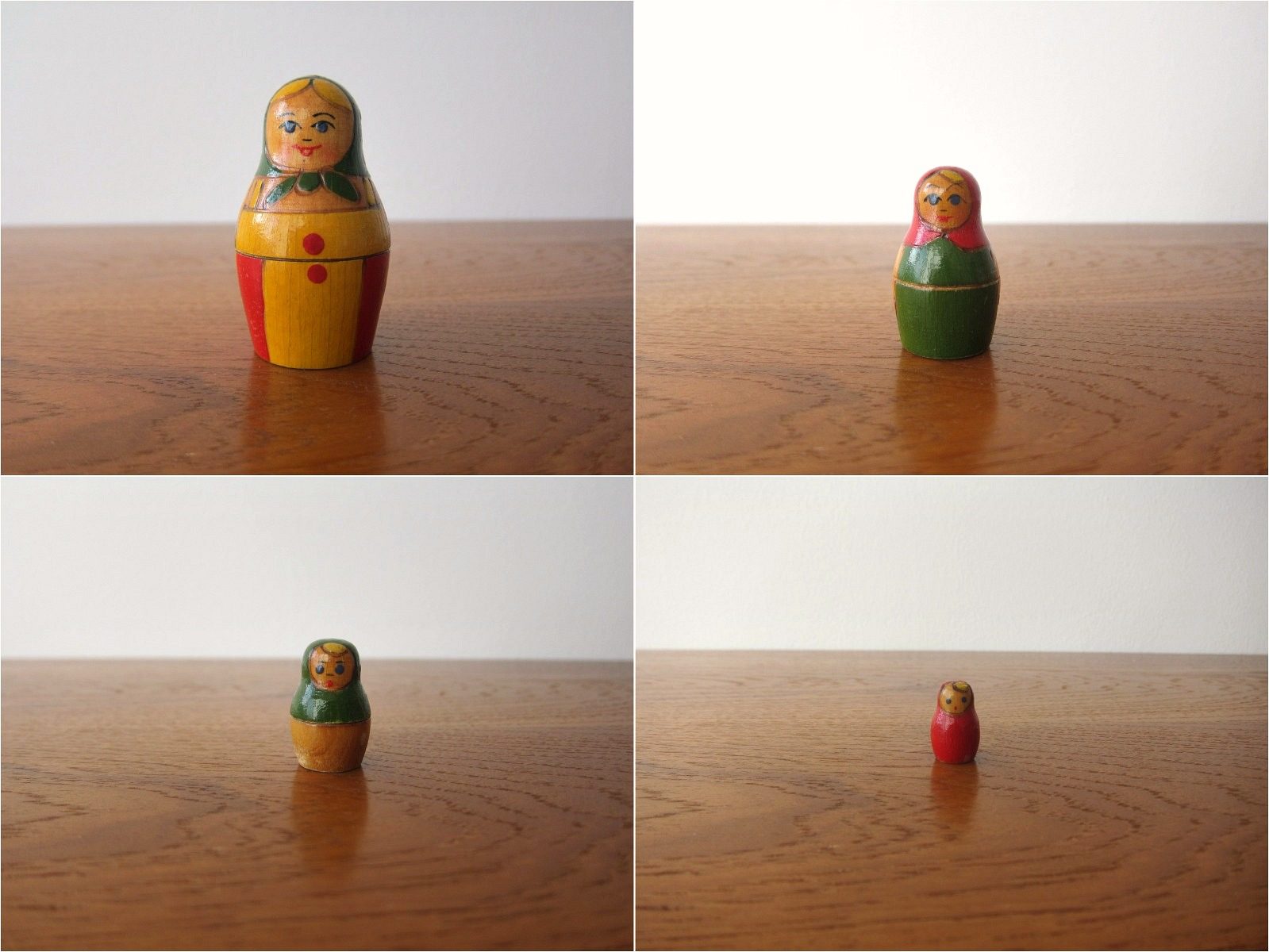 赤、黄色、緑などの原色がかわいいマトリョーシカ人形。 青い目をした、ほんわかしたノスタルジックな雰囲気があります。