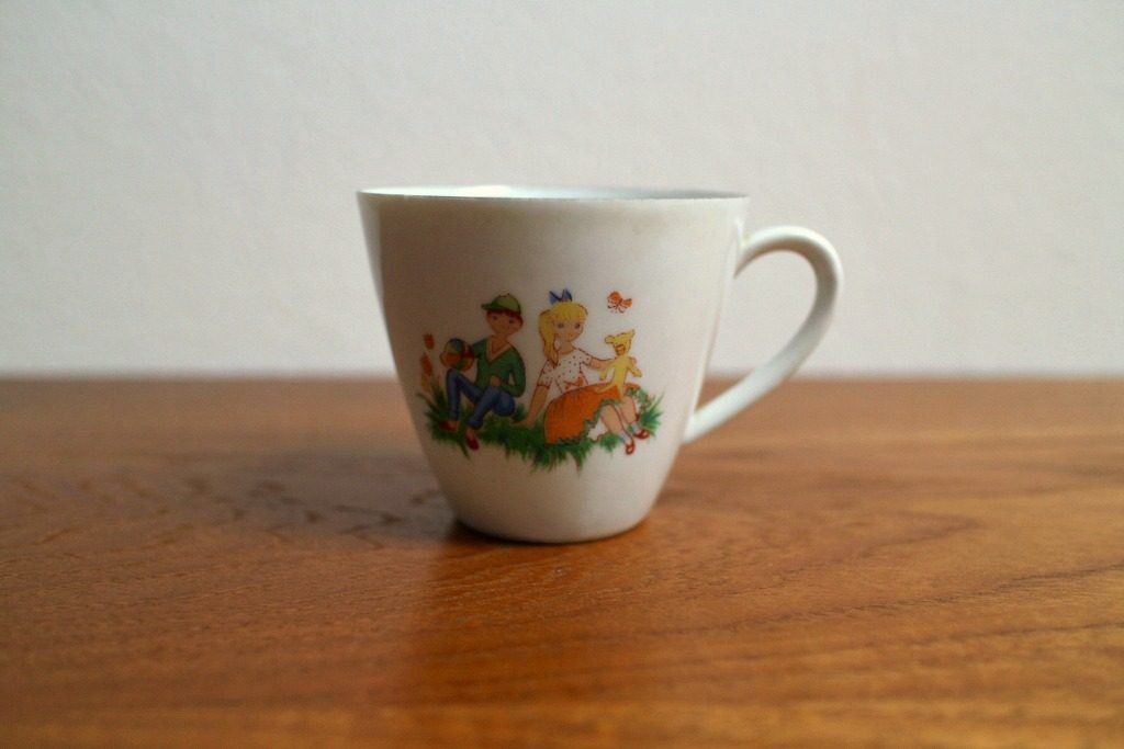 バイエルン州の陶器メーカーSeltmann Weiden社製キッズサイズの小さめカップ。 可愛い子どもとテディベアのイラストが入ったノスタルジックな50’s オリジナル。