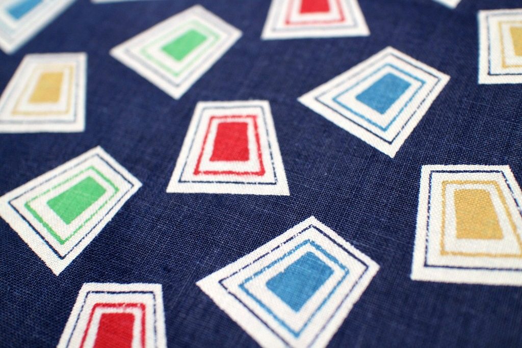 ダークなネイビー地いっぱいに広がる赤・青・黄・緑の台形モチーフがキュート。