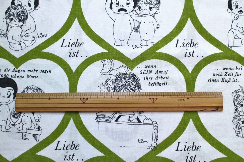 70年代に人気を博したニュージランド人コミック作家Kim Casaliの出世作「Liebe is.. (Love is..)」のさまざまなシーンを描いた、レアなヴィンテージファブリック。