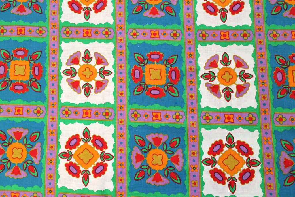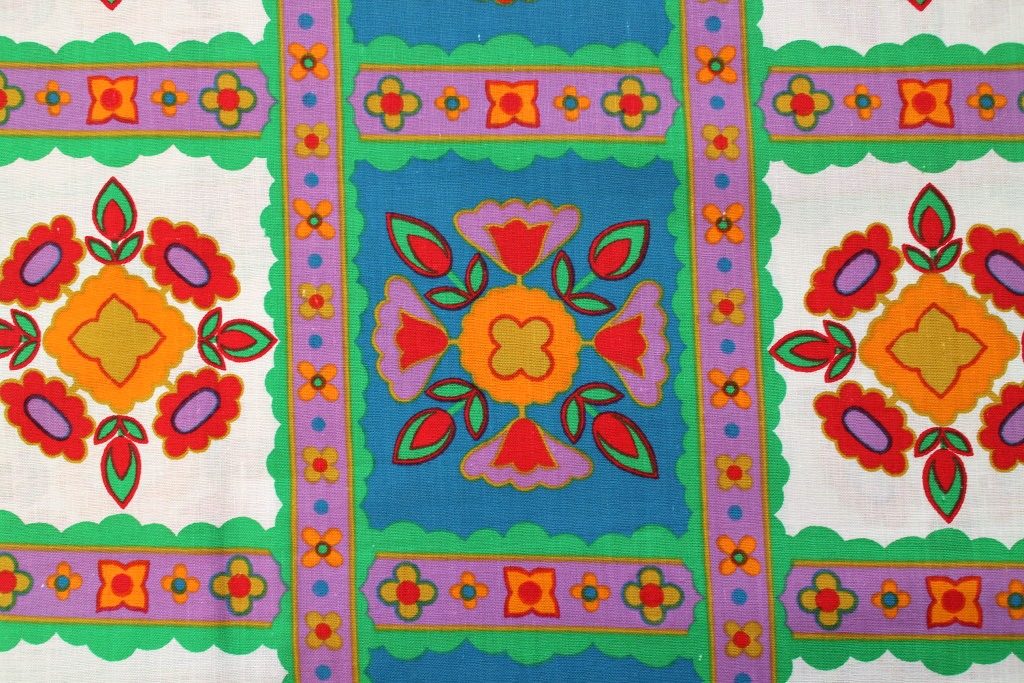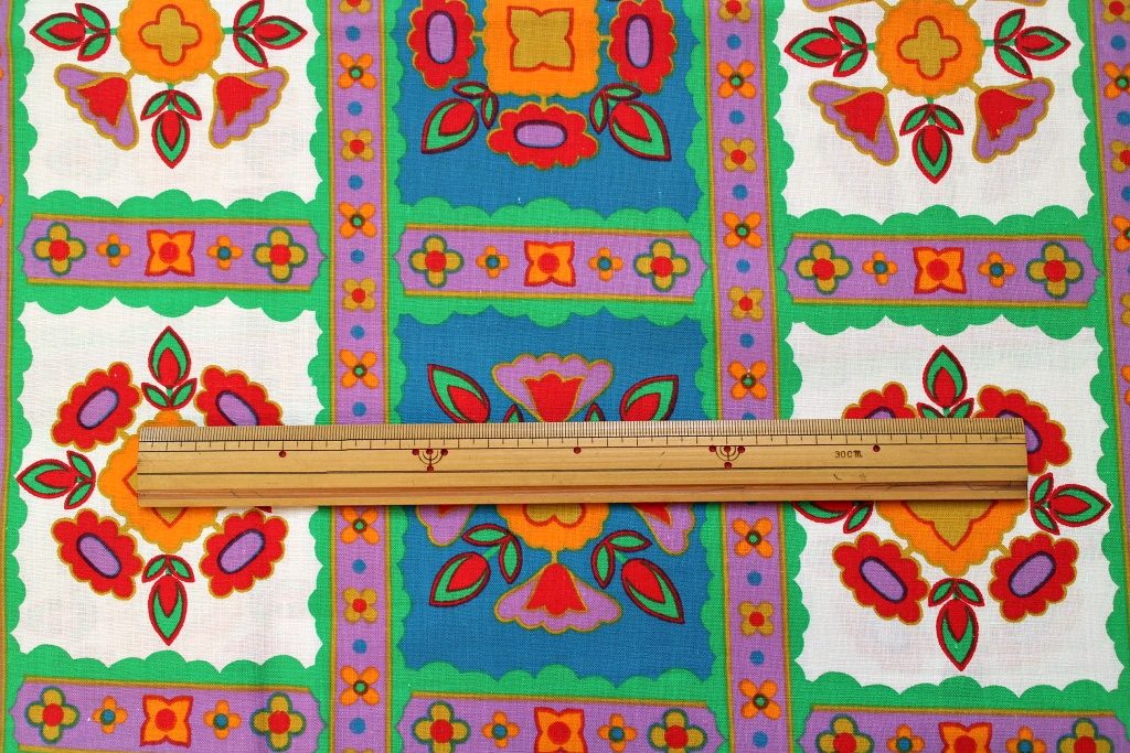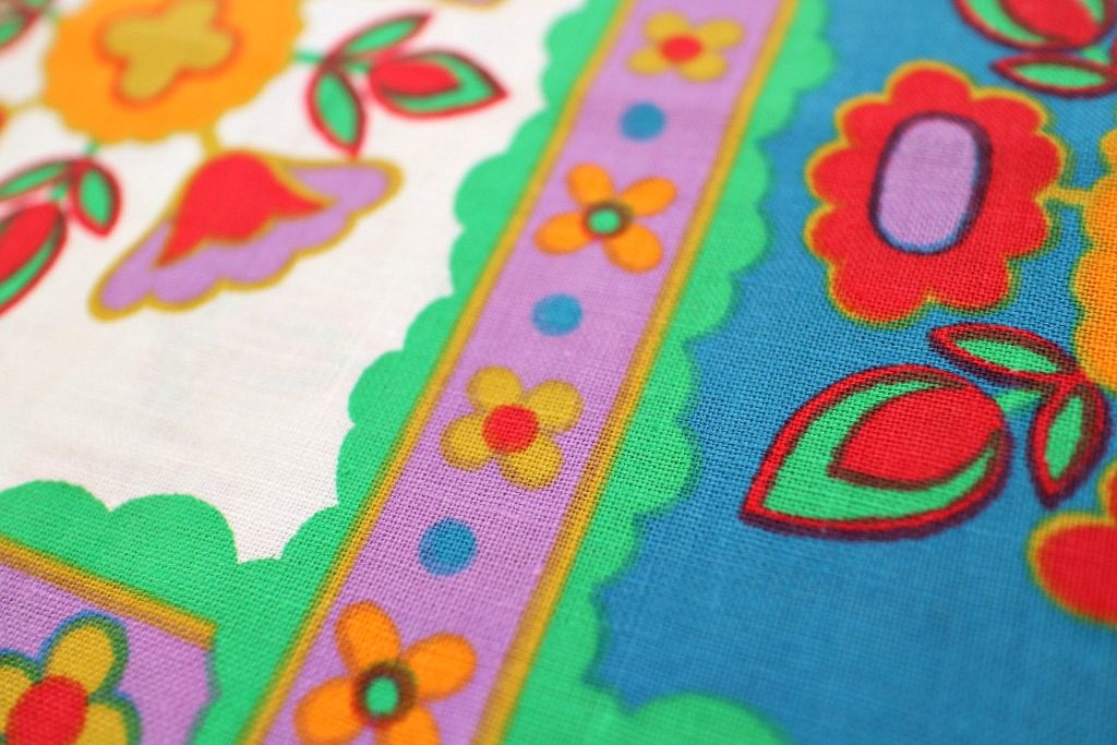 水色や薄紫・ライトグリーンなど個性の強い東欧的な色合いで描かれた民族調の花モチーフがレトロ感いっぱいの70sヴィンテージコットン生地。