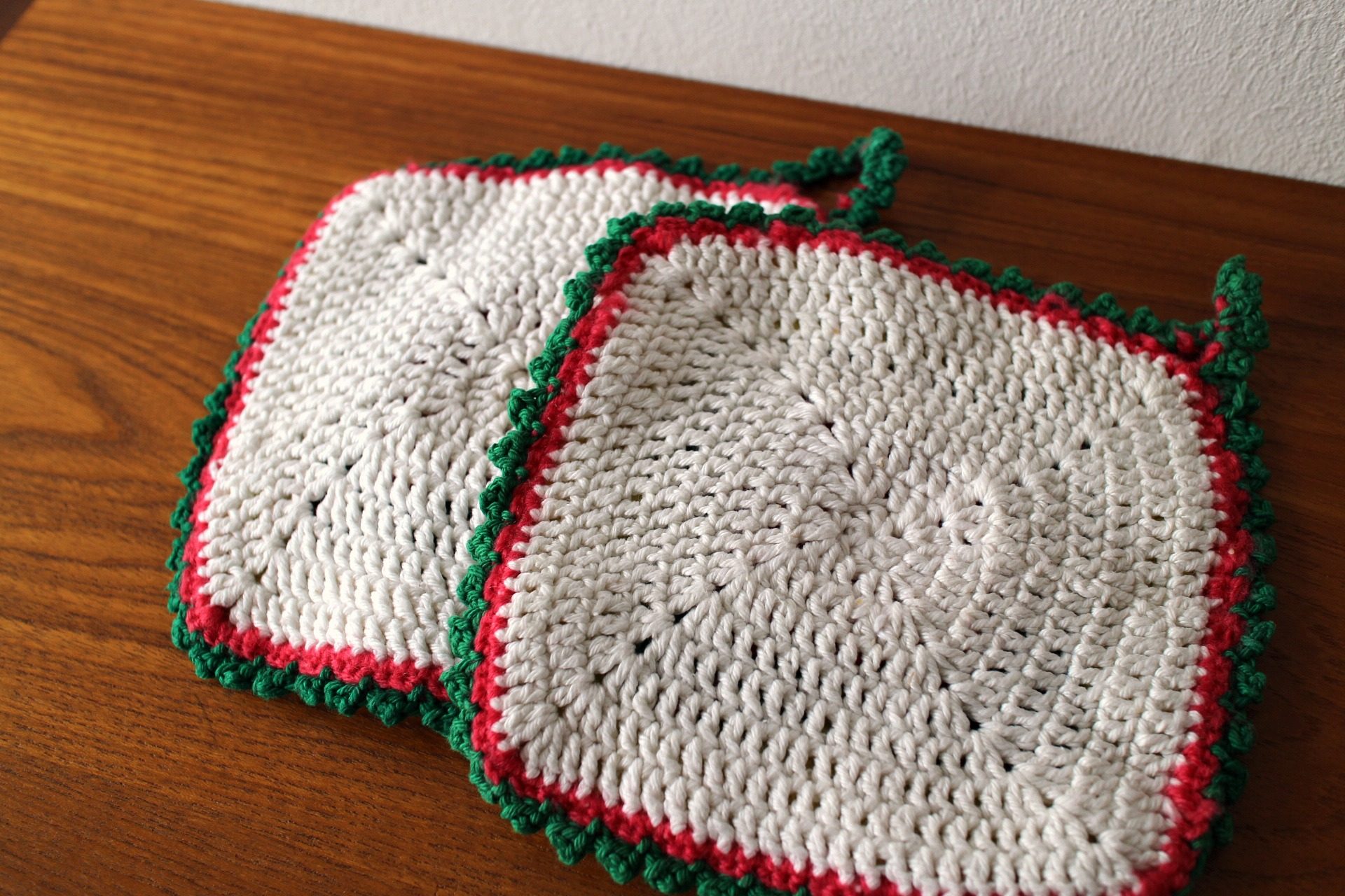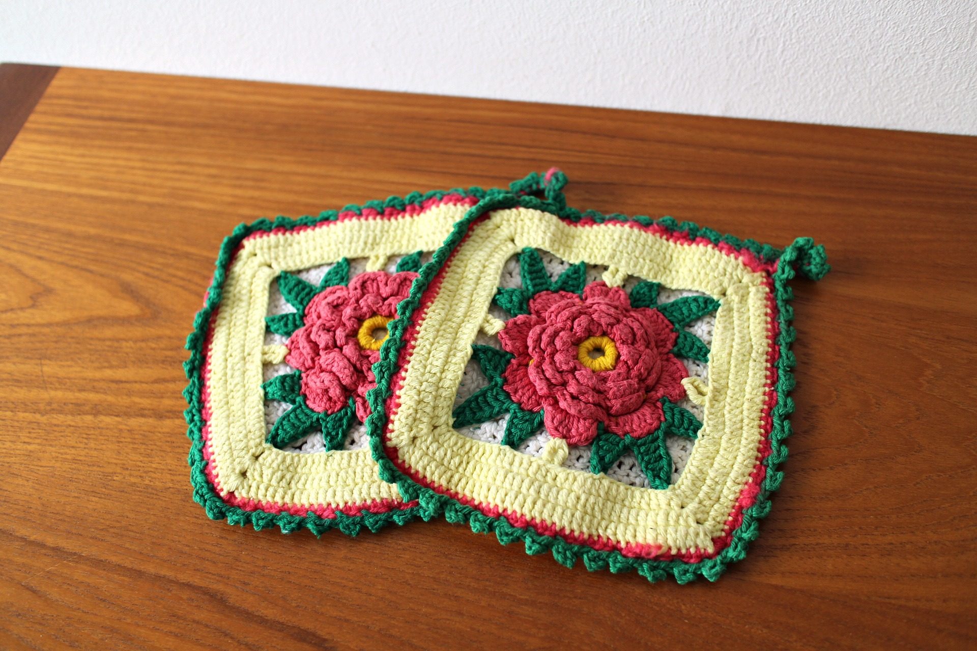 コンテンツにスキップ70年代レトロ ノスタルジックな手編みの鍋つかみ2枚セット(ローズ柄)