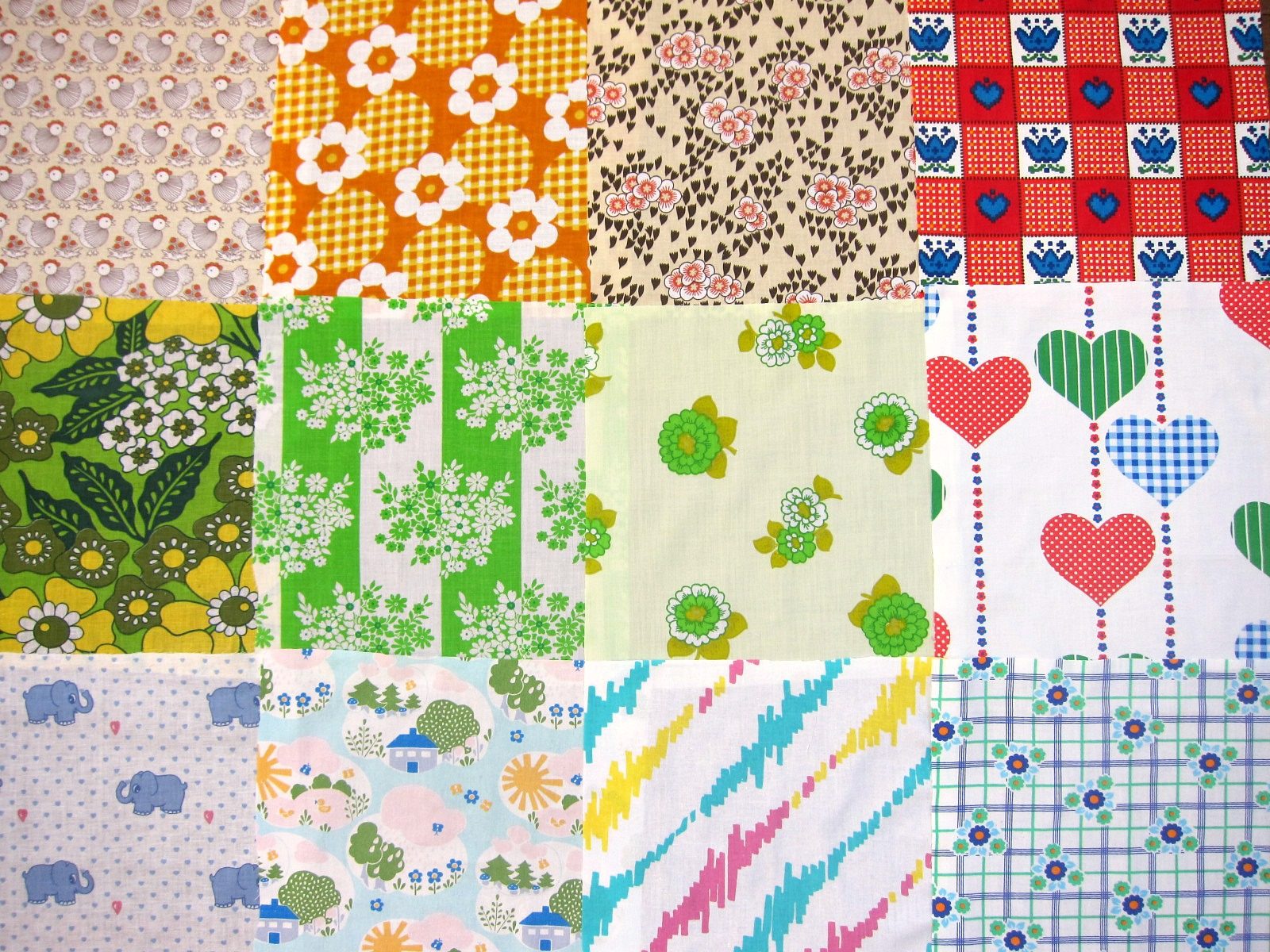 ノスタルジックなドイツの70年代ヴィンテージファブリックのはぎれを12枚セットにしました。