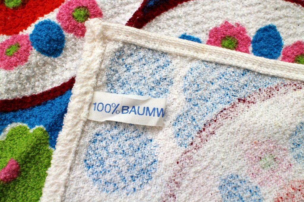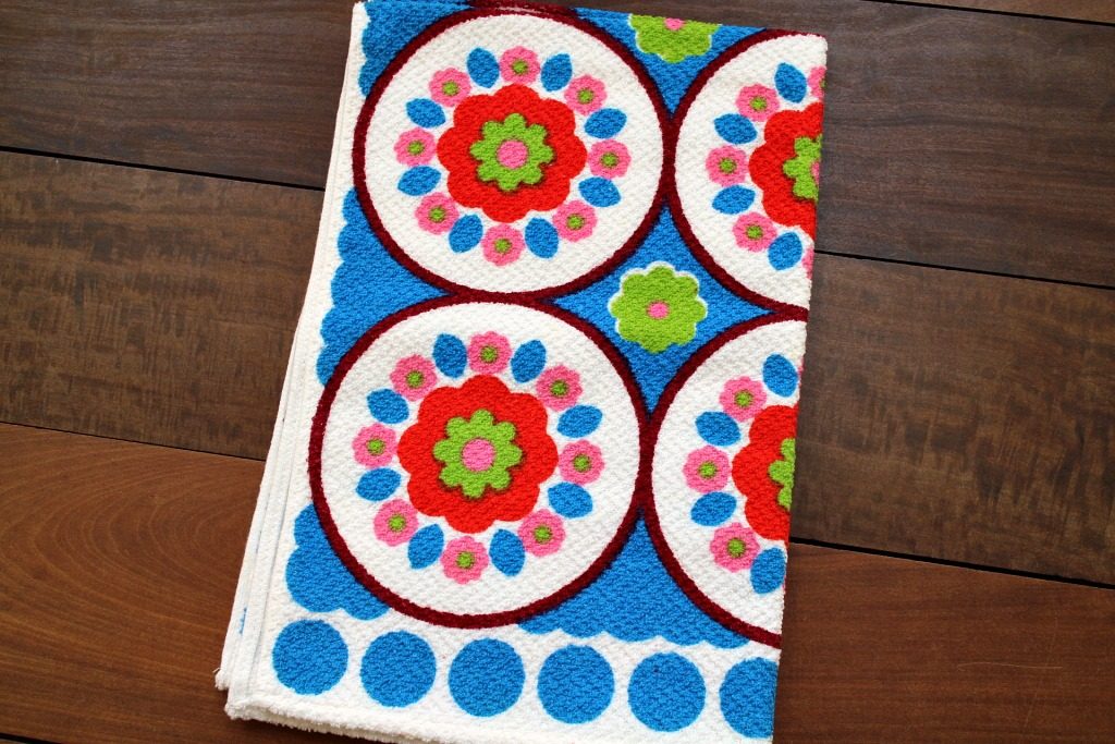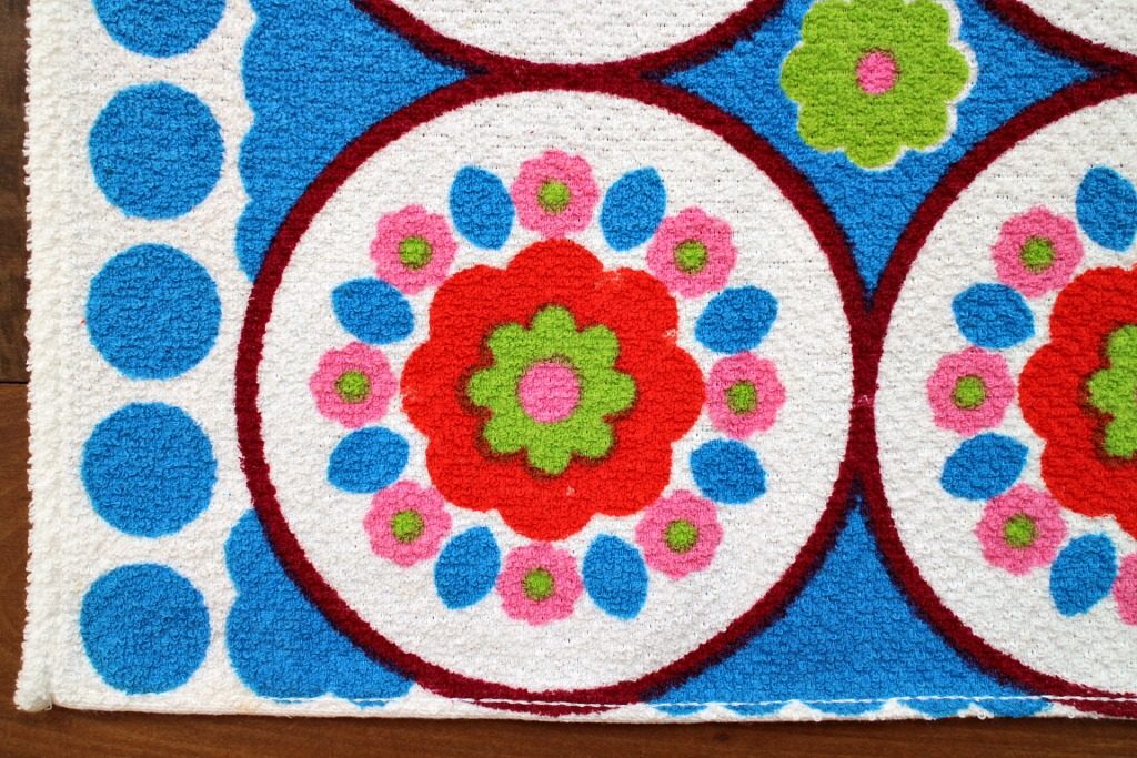 70年代に生産されたビビッドな花模様の未使用ヴィンテージタオル。