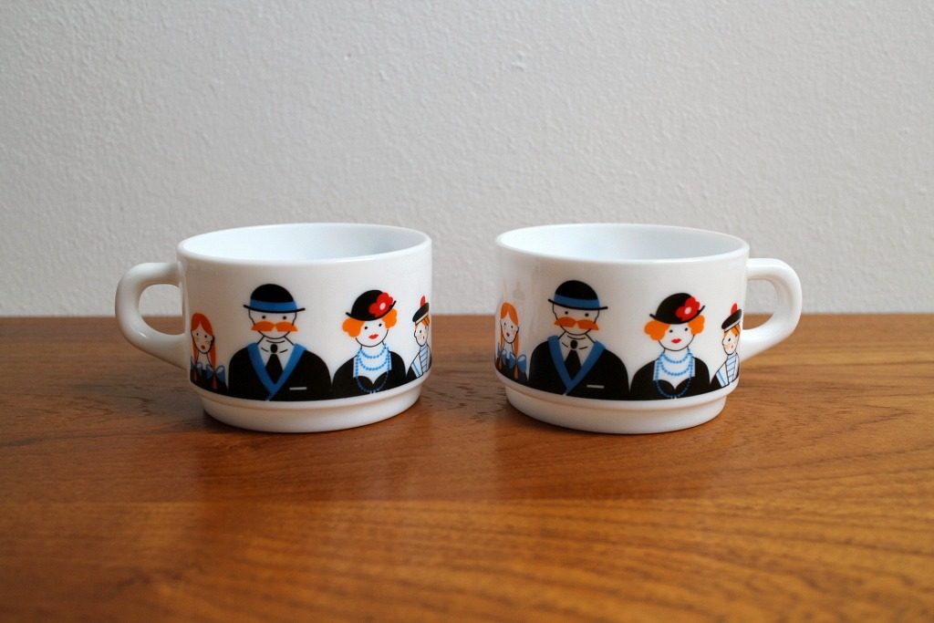 フォーマルウェアに身を包んだ4人家族が描かれた60-70年代のレアアイテムでカップ裏には arcopal FRANCE のマーク入り。