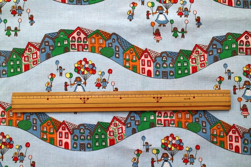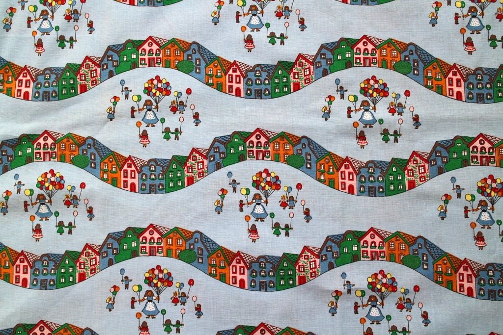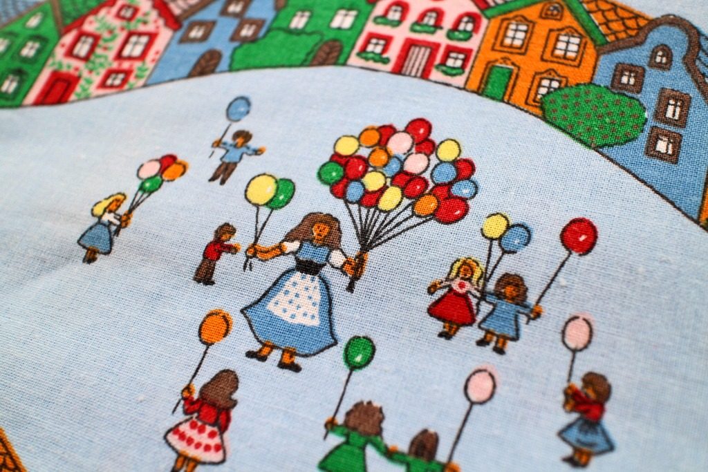 コンテンツにスキップ色とりどりのお家が波打つように描かれた薄いブルーのヴィンテージファブリック。街の広場には風船売り。