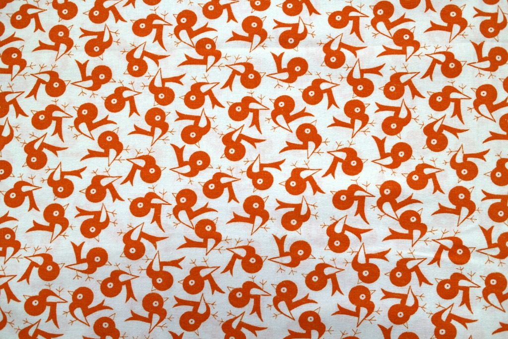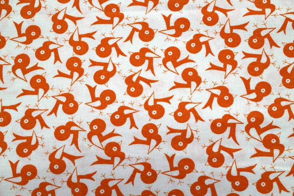 コンテンツにスキップ旧東ドイツ製キョロキョロ目玉が愛嬌たっぷりなオレンジ色のバード柄ヴィンテージファブリック。