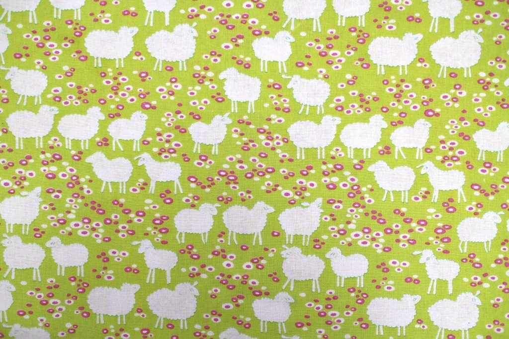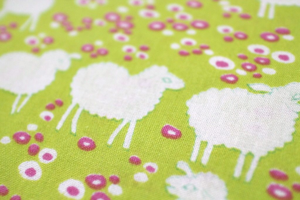 コンテンツにスキップライムカラーのお花畑に白く浮き上がるヒツジの群れが描かれた、大人気のレトロ柄ヴィンテージファブリック。