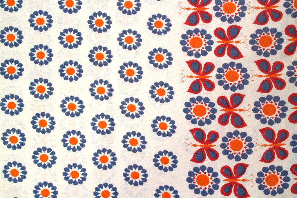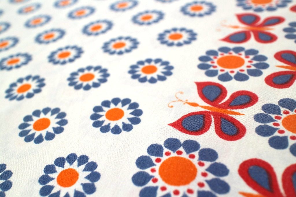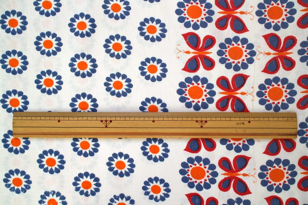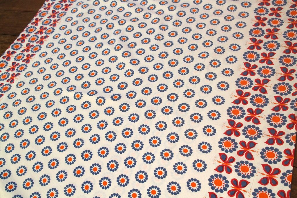 お花の真ん中にはオレンジのドット、そして生地の両端には3列に渡って蝶のモチーフが並んだ個性的なデザイン。