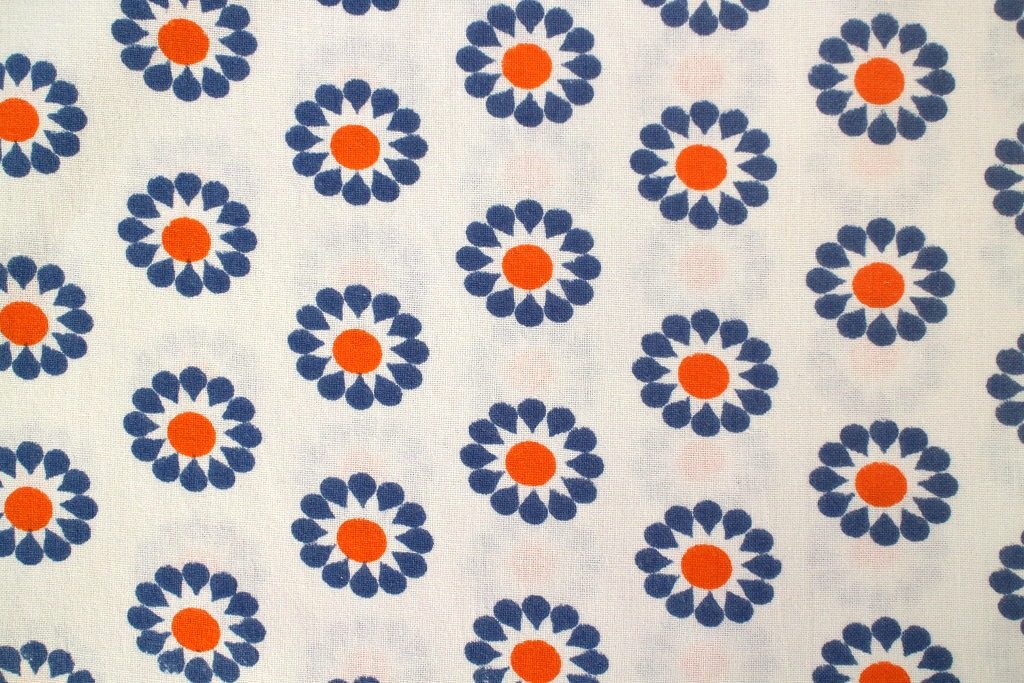 コンテンツにスキップ白地にブルーの丸い花モチーフが広がった旧東ドイツ製のレトロ生地。