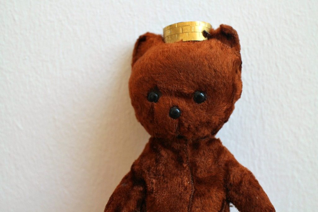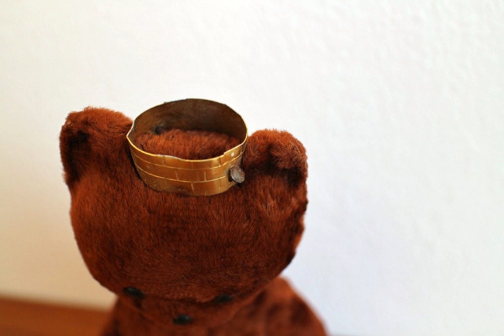 ぬいぐるみのような綿の詰まった柔らかいものではなく硬いボディとなっており、アルミでできた王冠は釘で打ち付けられています。