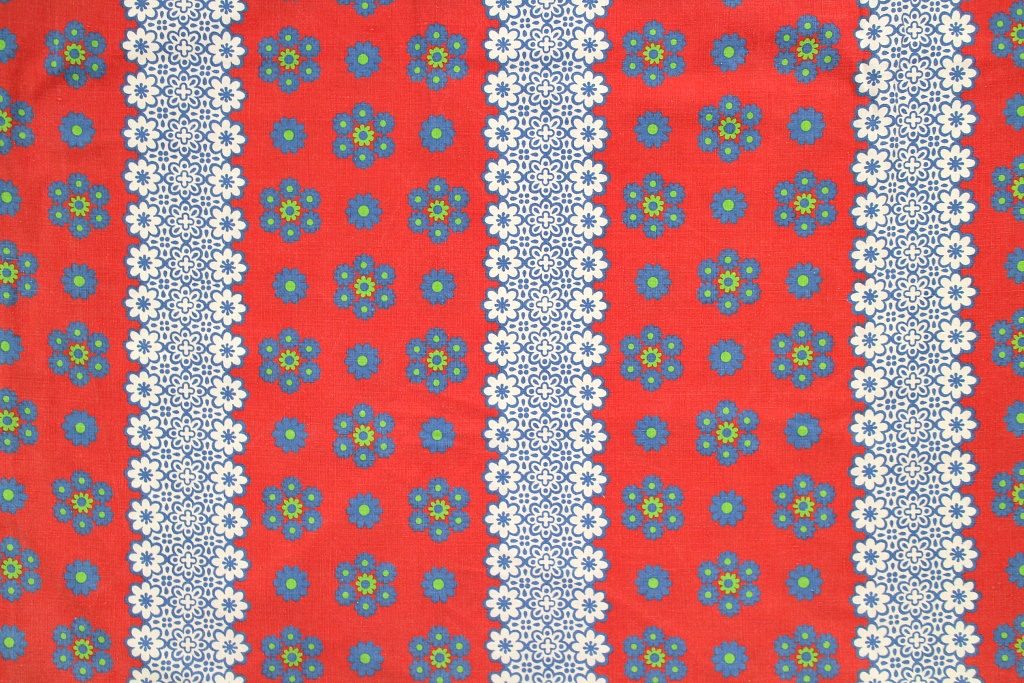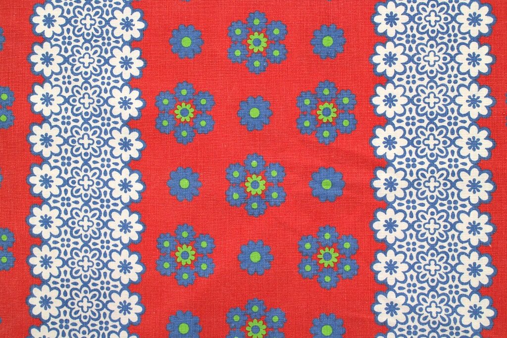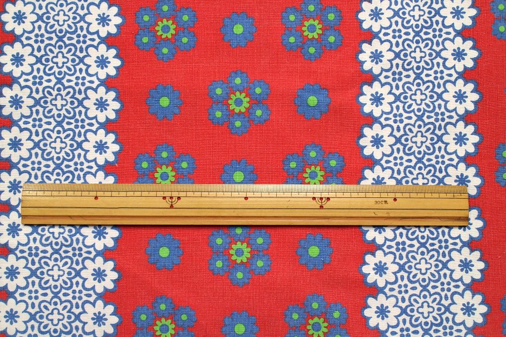 朱色を背景に落ち着きのあるブルーの花モチーフを重ねた、東欧らしい色合いが魅力のコットン生地。