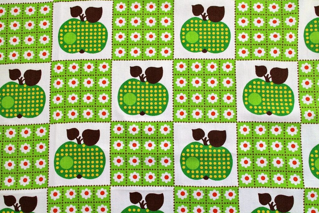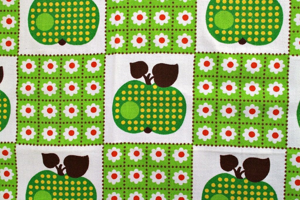ぷっくりとしたグリーンアップルと赤色がアクセントの小さなお花が仲良く格子に収まった、オランダDekoplus社製・鮮やかヴィンテージファブリック。